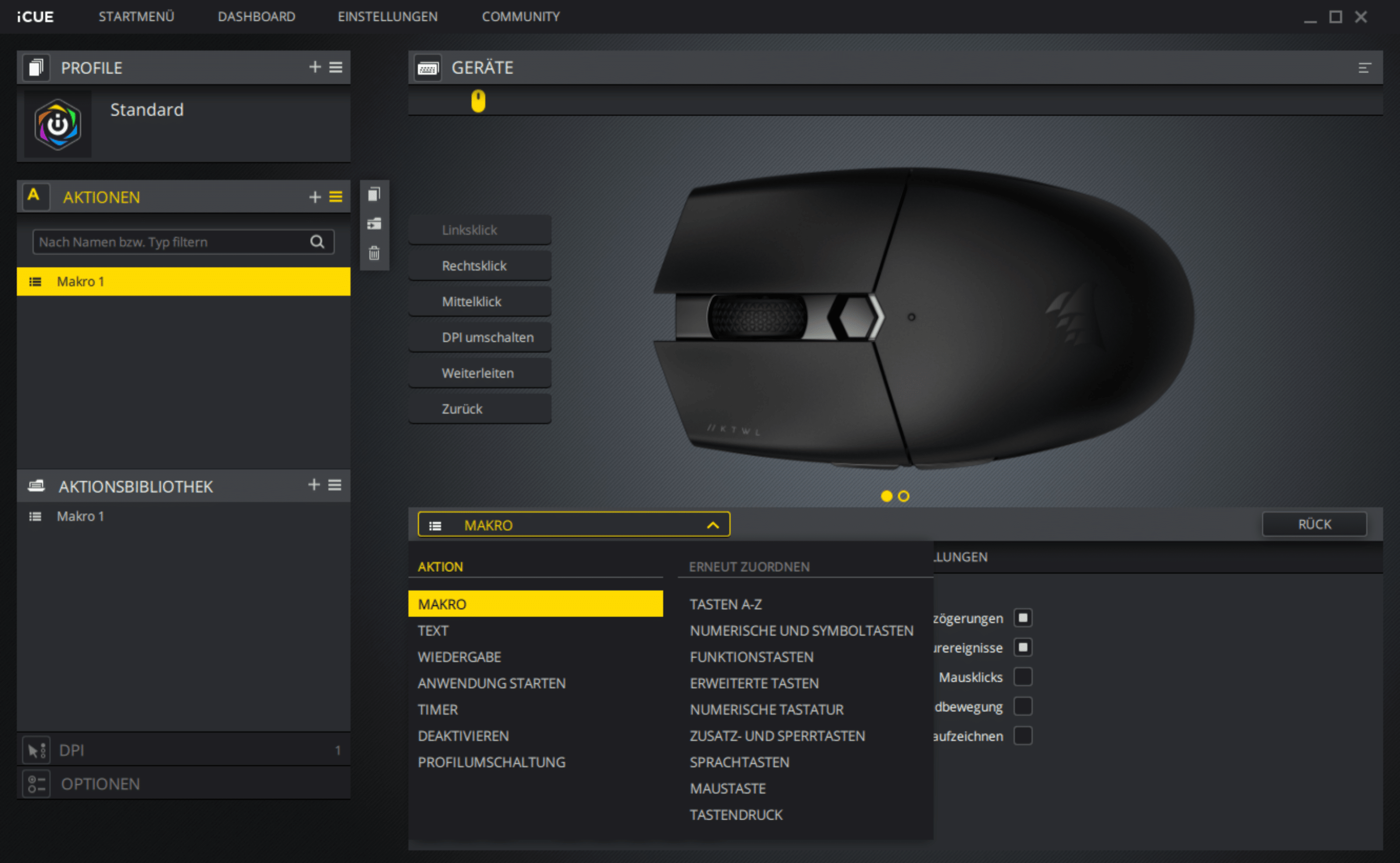 Aufgrund der fehlenden RGB-Beleuchtung ist der Funktionsumfang der Software natürlich eingeschränkt, doch alle übrigen Ansprüche kann iCUE auch hier voll abdecken. Im Programm können die einzelnen Tasten mit verschiedenen Makros und Tastatur- sowie Mausfunktionen belegt werden.