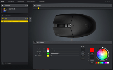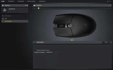 Natürlich kann auch die Messauflösung eingestellt werden: Zwischen 200 und 10.000 kann man auf 100 DPI genau jeden Wert einstellen. Dabei stehen drei unterschiedliche Profile zur Verfügung, die durch die DPI-Taste gewechselt und durch eine frei konfigurierbare Farbe visualisiert werden. Auch eine Scharfschützen-Funktion steht zur Verfügung, für die Nutzung derselben muss man allerdings eine der Tasten neu belegen.