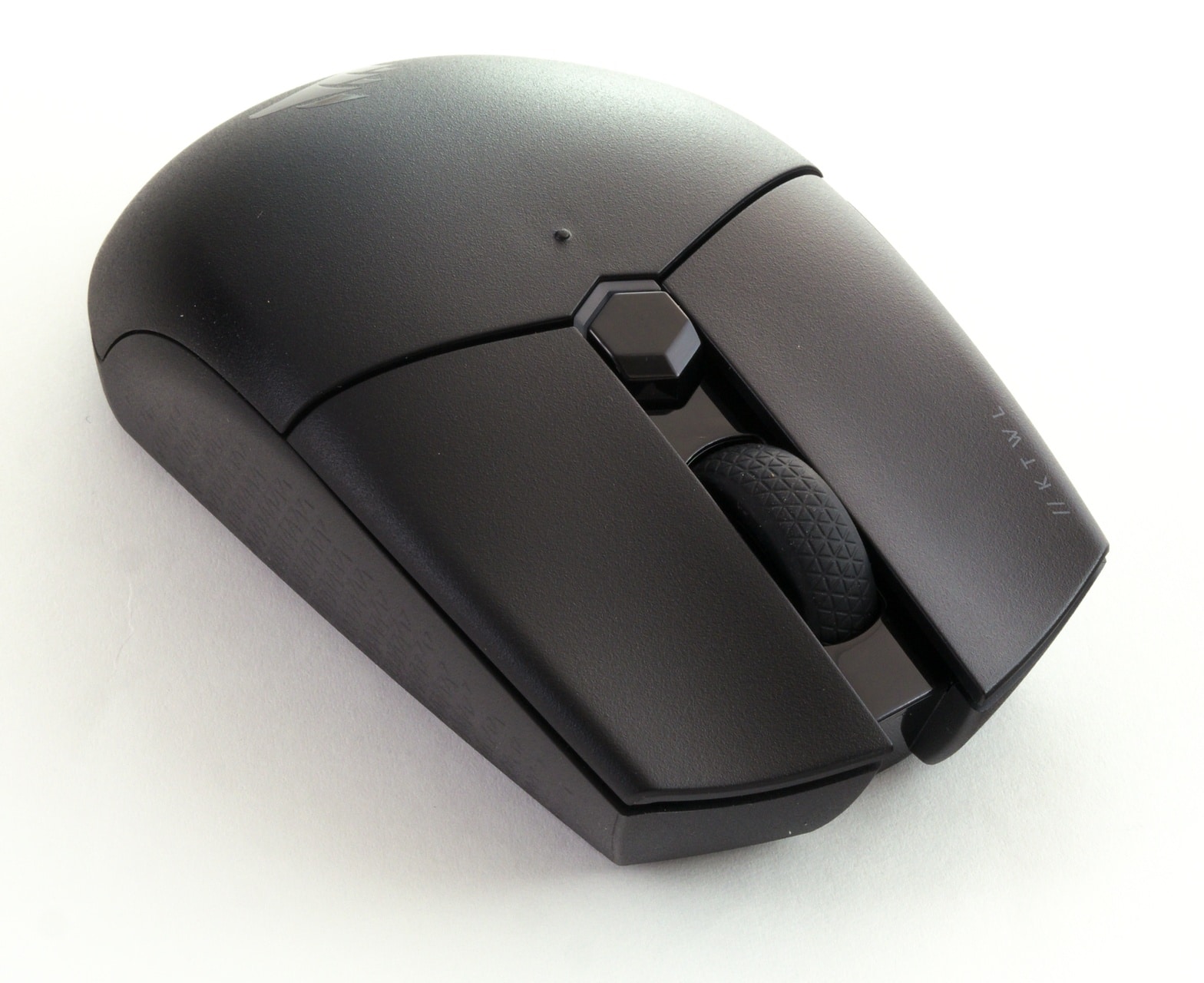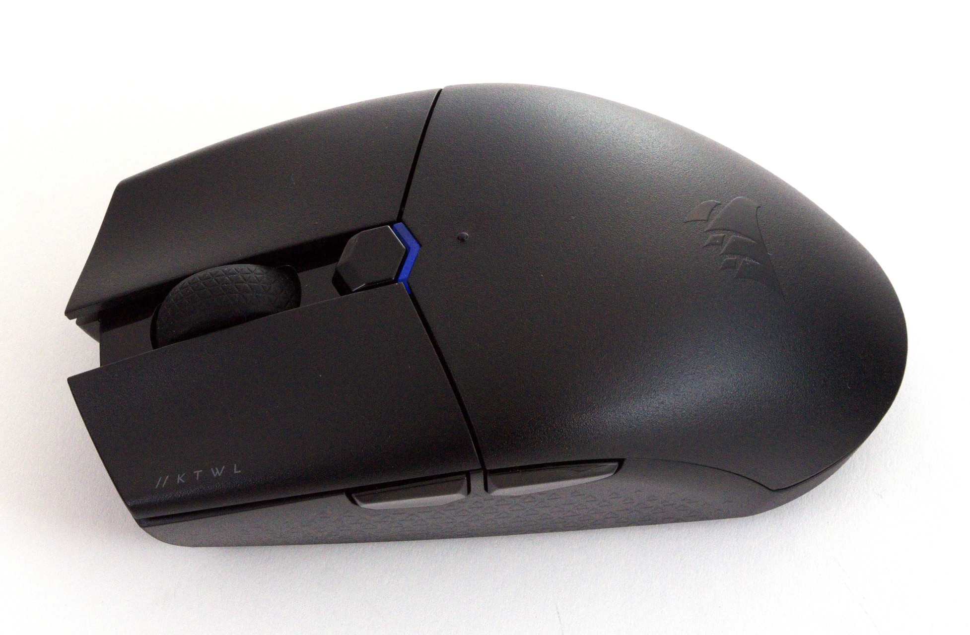 An Zusatztasten bietet Corsair die Gaming-Mindestausstattung: Eine Vor- und Zurück-Taste sind an der linken Seite der Maus angebracht, und hinter dem Mausrad befindet sich eine DPI-Taste mitsamt einer LED, die den aktuellen Status der Maus anzeigt. Auf der Unterseite der Maus befindet sich zudem ein dreistufiger Schalter, mit dem man die Maus anschalten und den Bluetooth- oder WLAN-Modus aktivieren kann. Diese beiden Betriebsmodi sind dabei die einzige Option für die Maus: Einen USB-Anschluss gibt es nicht.