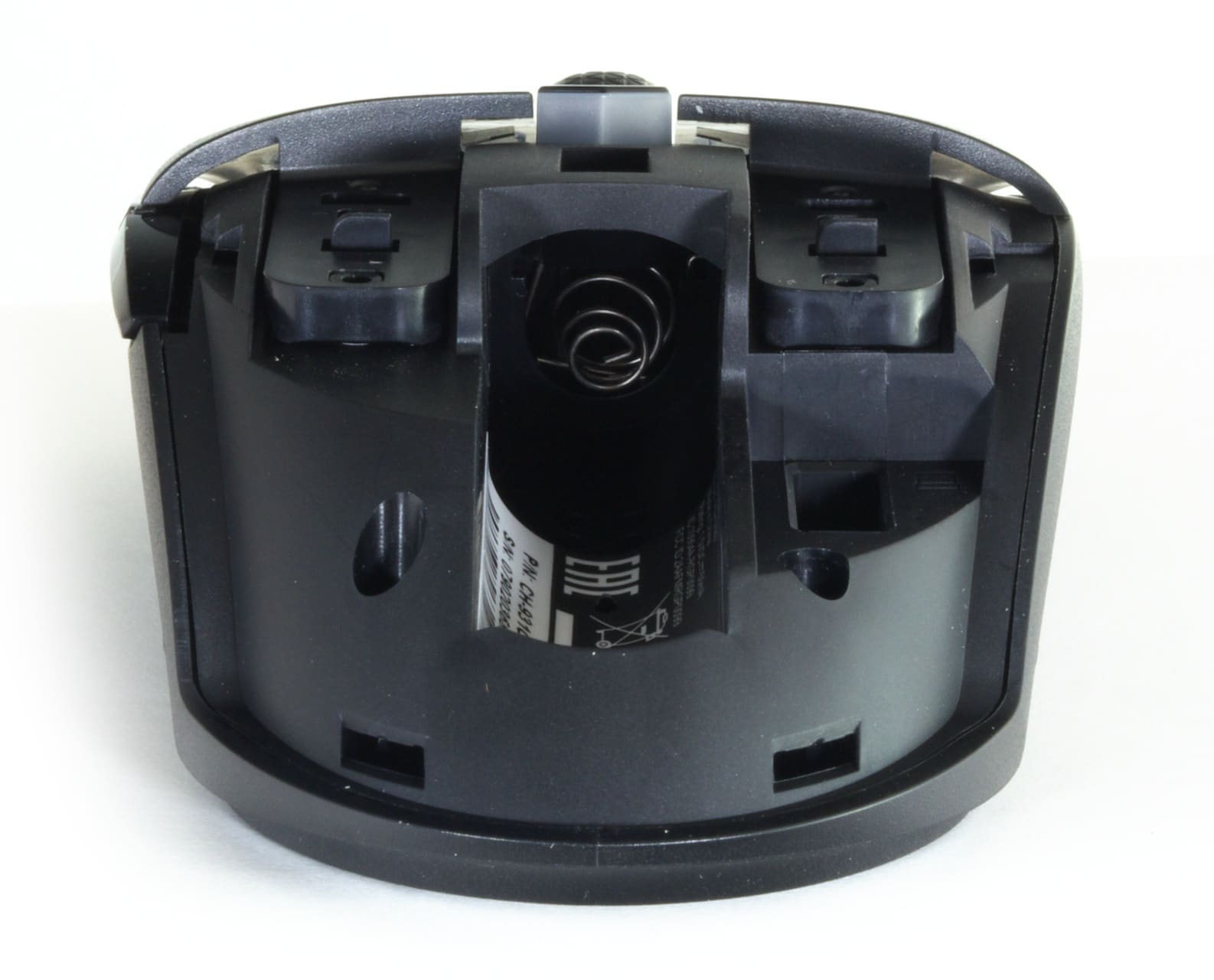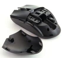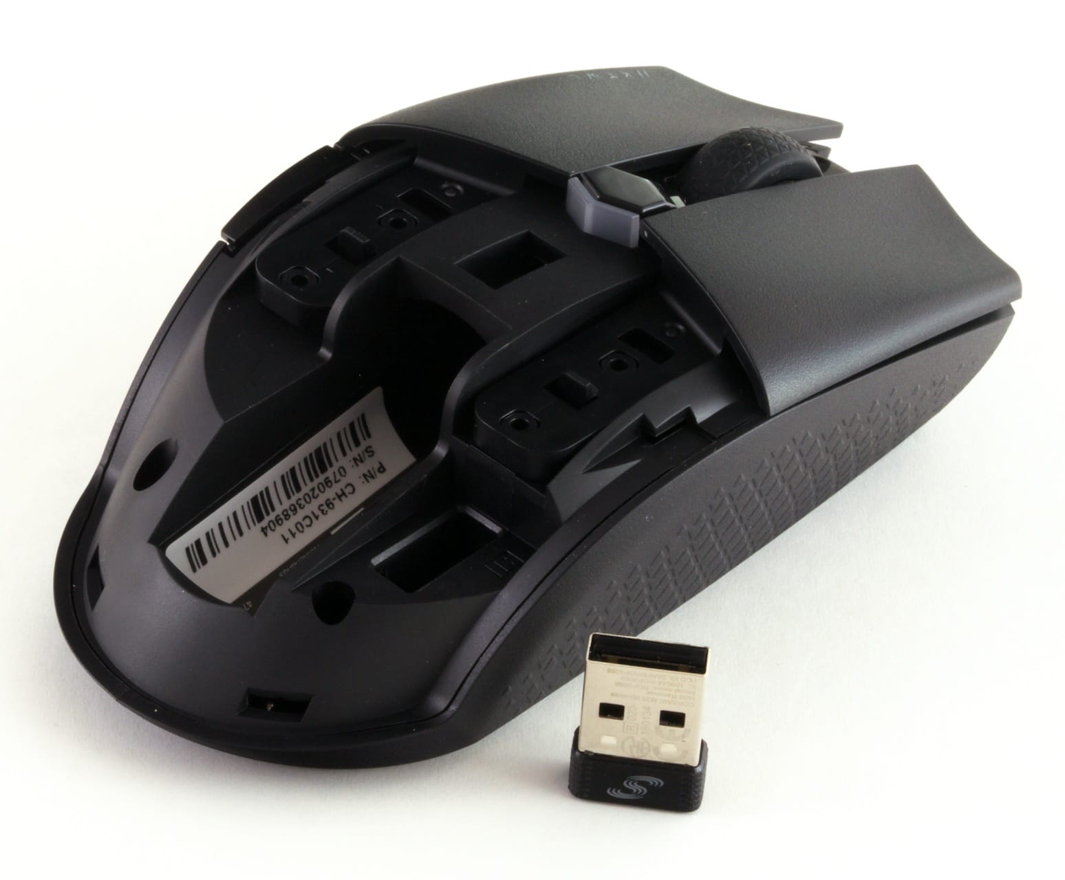 Am Mausrücken ist eine kleine Erhebung zu erkennen, die den Öffnungsmechanismus am Mausrücken markiert. Drückt man das Gehäuse dort nach unten, kann man den Mausrücken leicht abziehen und man gelangt zum Akkufach und dem 2,4-GHz-Sensor, der dort verstaut werden kann.