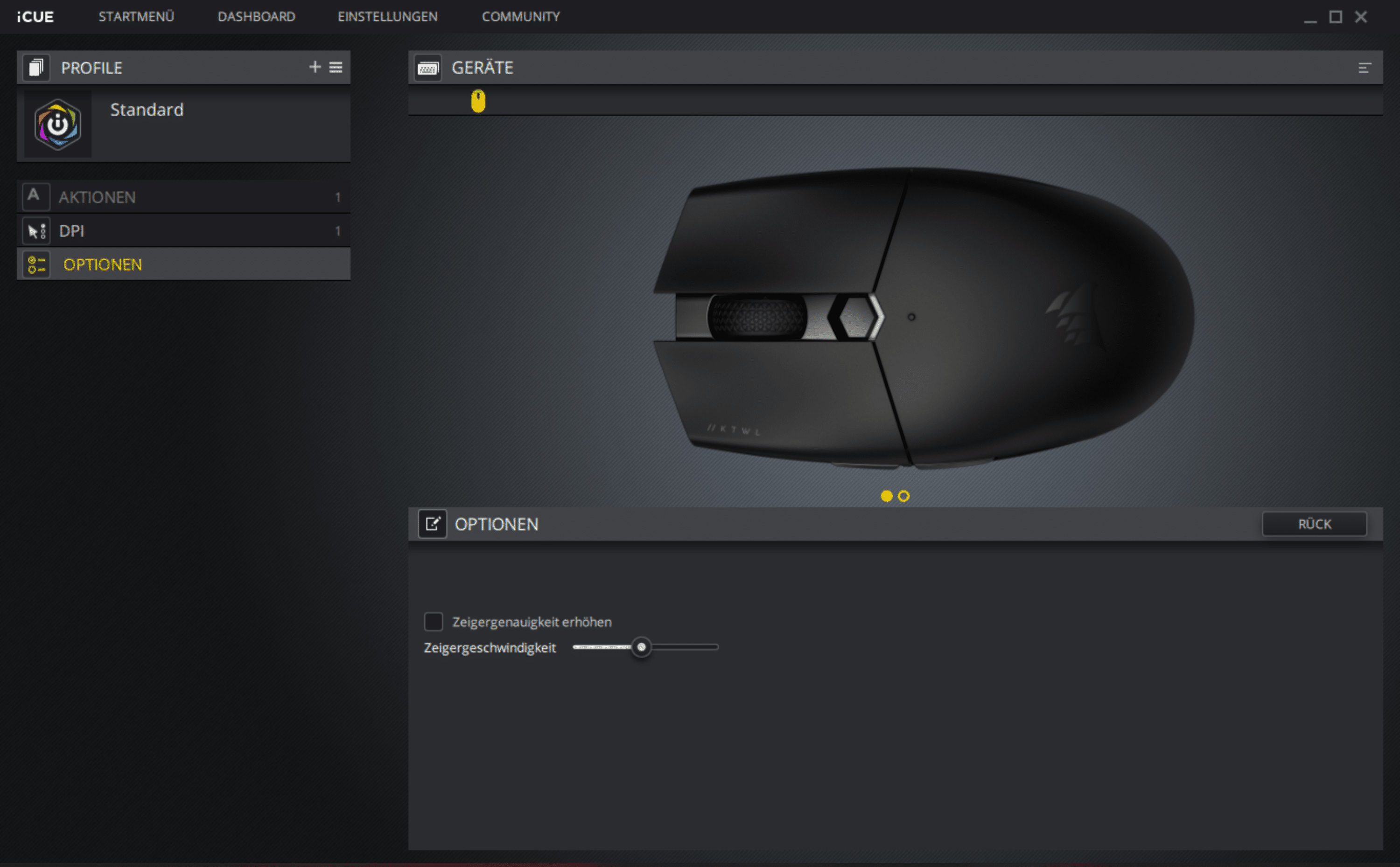 Wie üblich lässt sich die Katar Pro Wireless über Corsairs iCUE-Software konfigurieren, die schnell und ohne Registrierungszwang installiert werden kann. Das Programm verfügt über ein übersichtliches, modernes UI und wird übergreifend für alle Corsair-Produkte eingesetzt.