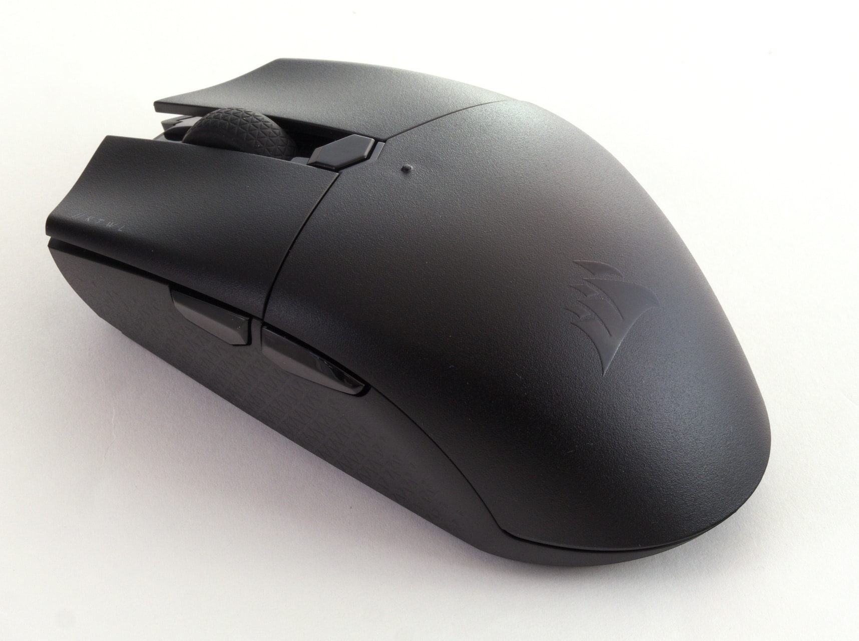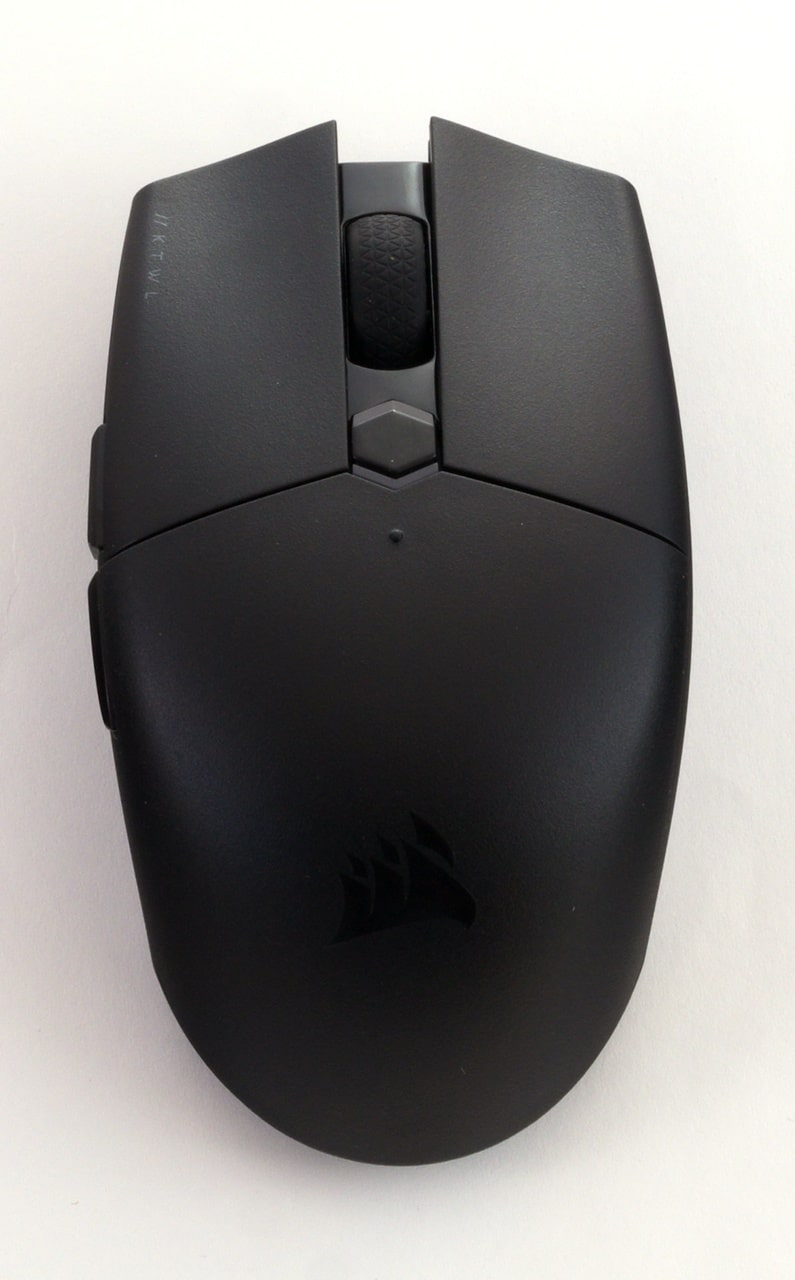 Optisch erinnert die Katar Pro Wireless auf den ersten Blick an eine typische Office-Maus: Das Gehäuse ist bis auf die beiden seitlichen Zusatztasten symmetrisch, und als Material setzt Corsair hauptsächlich auf mattschwarzen, leicht rauen Kunststoff.