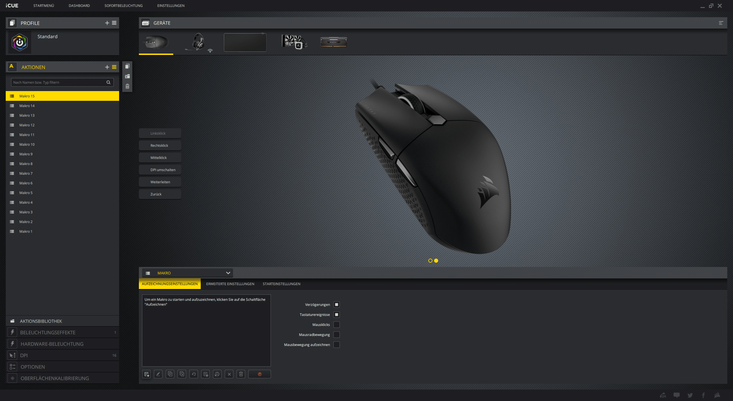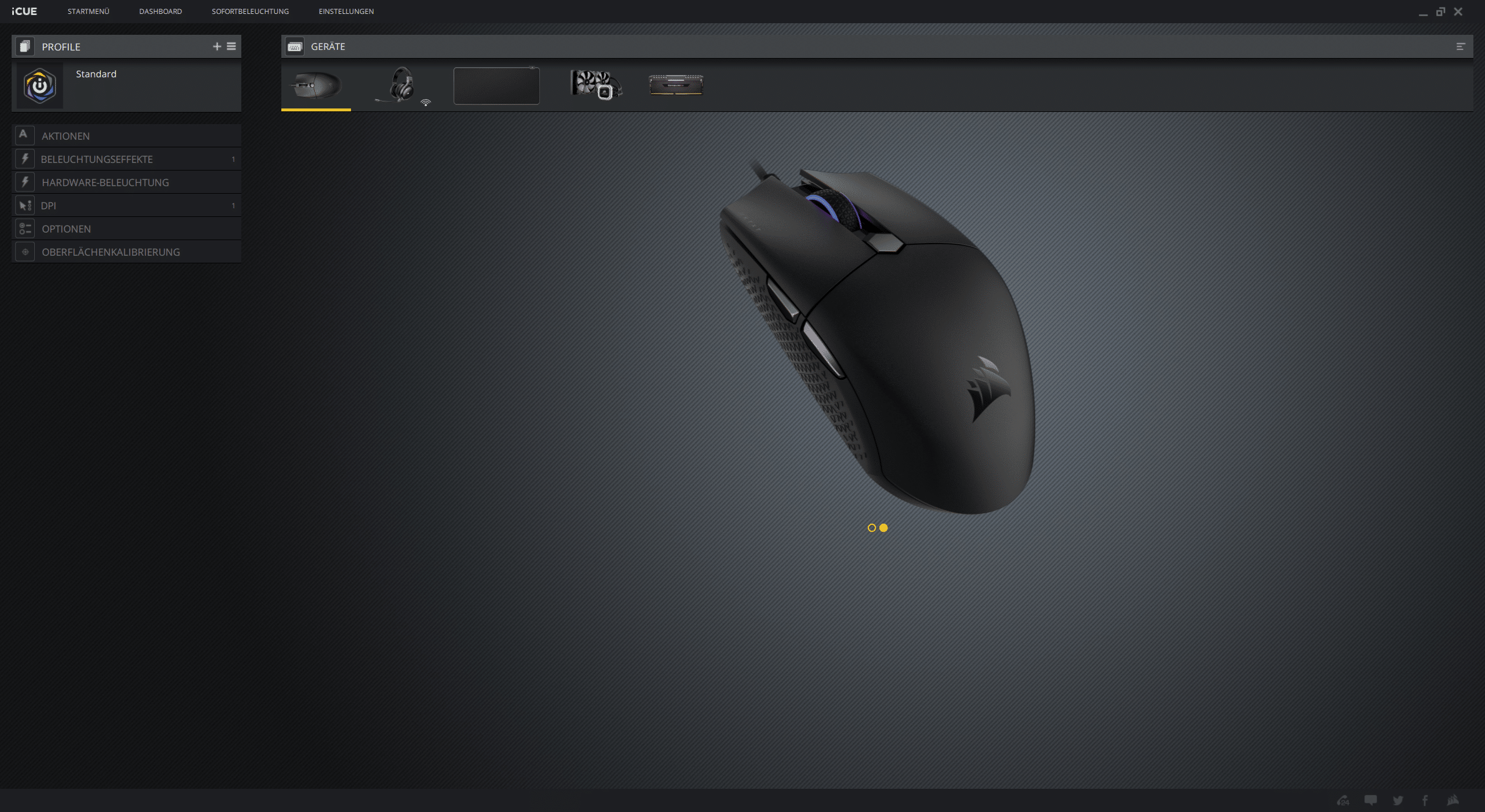 Wie man es von Corsair gewohnt ist, werden alle Produkte gesammelt in der App iCUE angezeigt. Dort lassen sie sich auch alle nach ihren Möglichkeiten einstellen und zum Teil sogar aufeinander abstimmen. Für die Katar Pro XT sind das die folgenden Bereiche: Aktionen, Beleuchtungseffekte, Hardware-Beleuchtung, DPI, Optionen, Oberflächenkalibrierung. Unter dem Reiter Aktionen lassen sich diverse Makros hinterlegen, die dann ausgeführt werden können. Hier gibt es kaum Einschränkung, lediglich muss man bedenken, dass die Makros nicht auf der Maus selbst gespeichert werden, sondern lediglich über die App iCUE auf dem Rechner vorhanden sind.