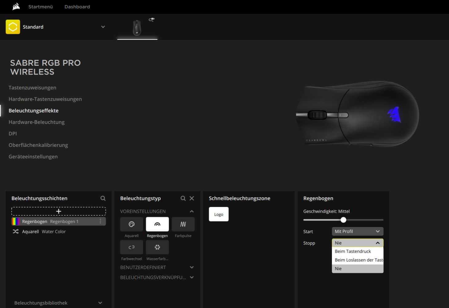 Softwareseitig greift die Sabre RGB Pro Wireless einmal mehr auf Corsairs neueste iCUE-Version zurück, die zweifelsohne zu den umfangreichsten (und hinsichtlich des Speicherplatzes auch größten) Begleit-Anwendungen für Peripheriegeräte zählt. Mit Version 4 hat die Software einen neuen Anstrich erhalten und präsentiert sich nun deutlich aufgeräumter.