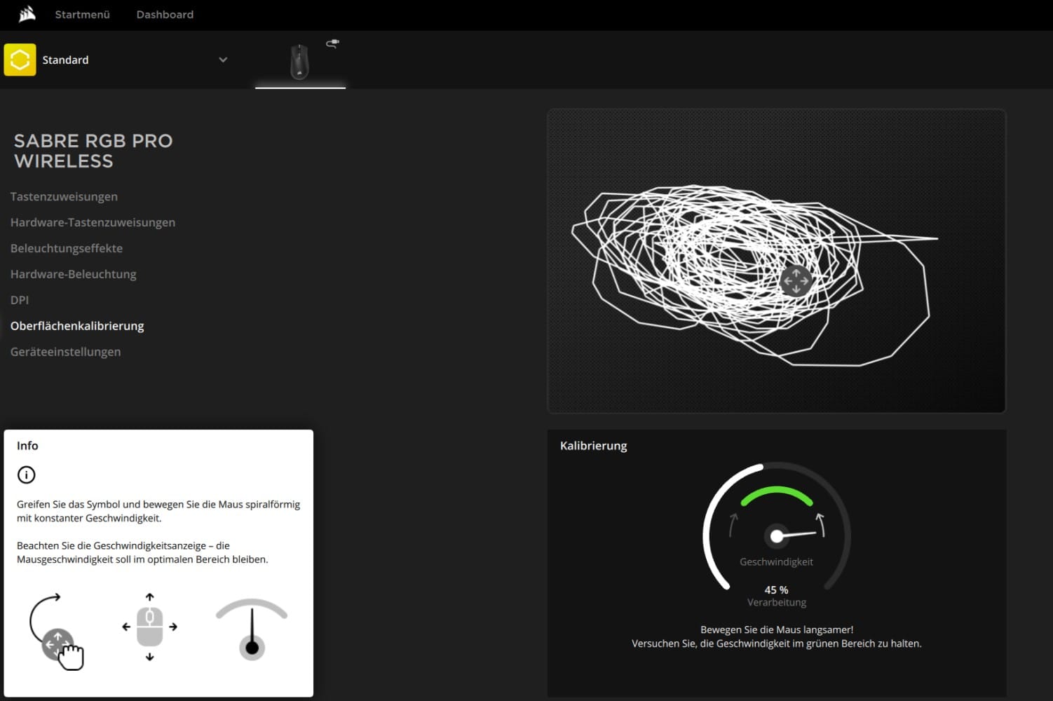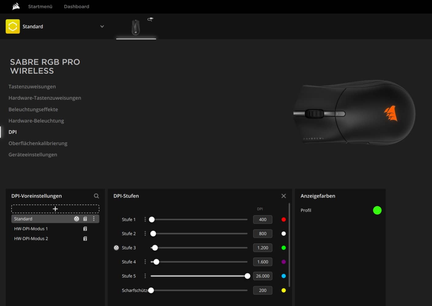 Hinsichtlich der DPI-Voreinstellungen besteht zudem die Möglichkeit, zwei verschiedene Profile samt insgesamt sechs Stufen anzulegen und direkt auf der Maus abzuspeichern. Außerdem kann die Gaming-Maus mittels Oberflächenkalibrierung optimal auf das verwendete Mauspad eingestellt werden. Die verschiedenen Betriebsmodi hat die Wireless-Variante dabei von der Sabre RGB Pro geerbt. Zur Wahl stehen ein Hardware-Mode, der stets aktiv ist, sofern iCUE nicht auf dem Endgerät vorhanden ist und der Software-Mode, sofern iCUE vorhanden ist.