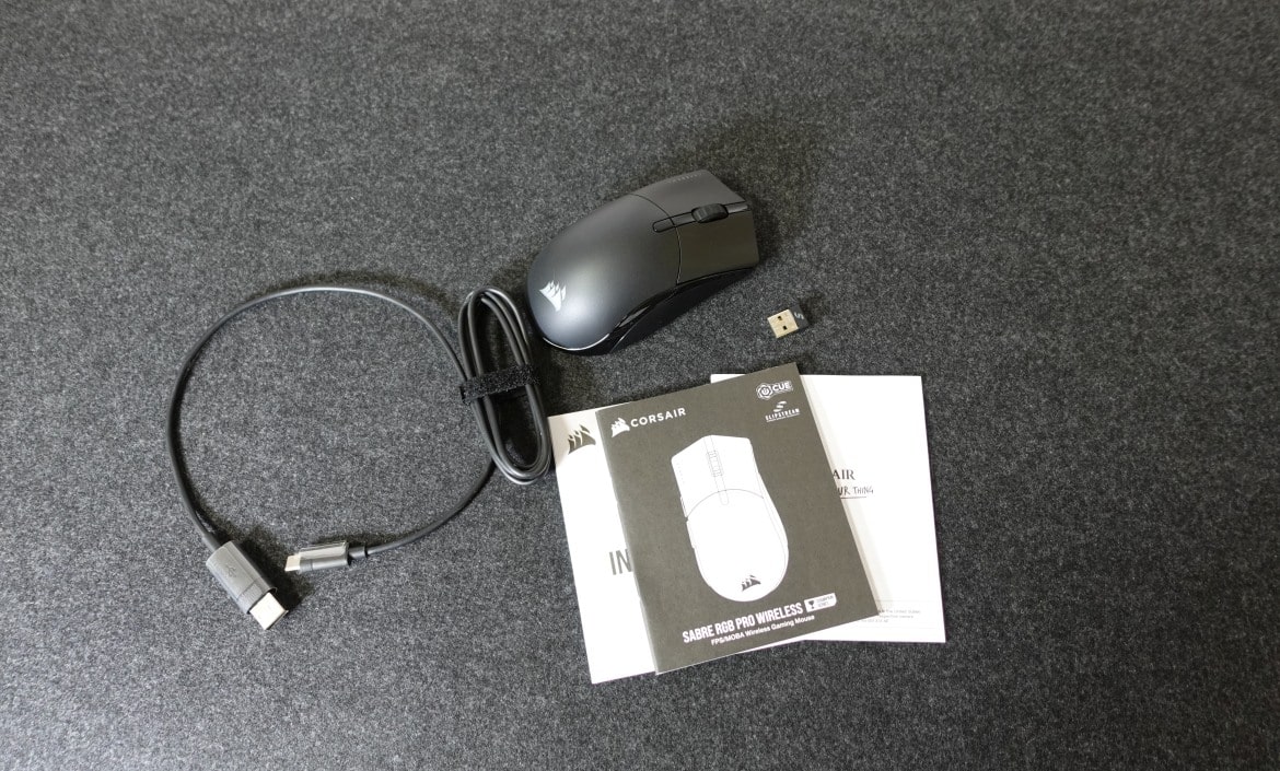 Im Inneren findet die Maus in einer Plastikverpackung Platz, die auf den ersten Blick stark an ihren kabelgebundenen Artverwandten erinnert. Lediglich der kleine USB-Dongle und das 1,8 Meter lange USB-A-auf-USB-C-Ladekabel verraten neben dem „SABREWL“-Schriftzug auf dem Mausrücken, dass wir es hier mit dem Wireless-Modell zu tun haben.