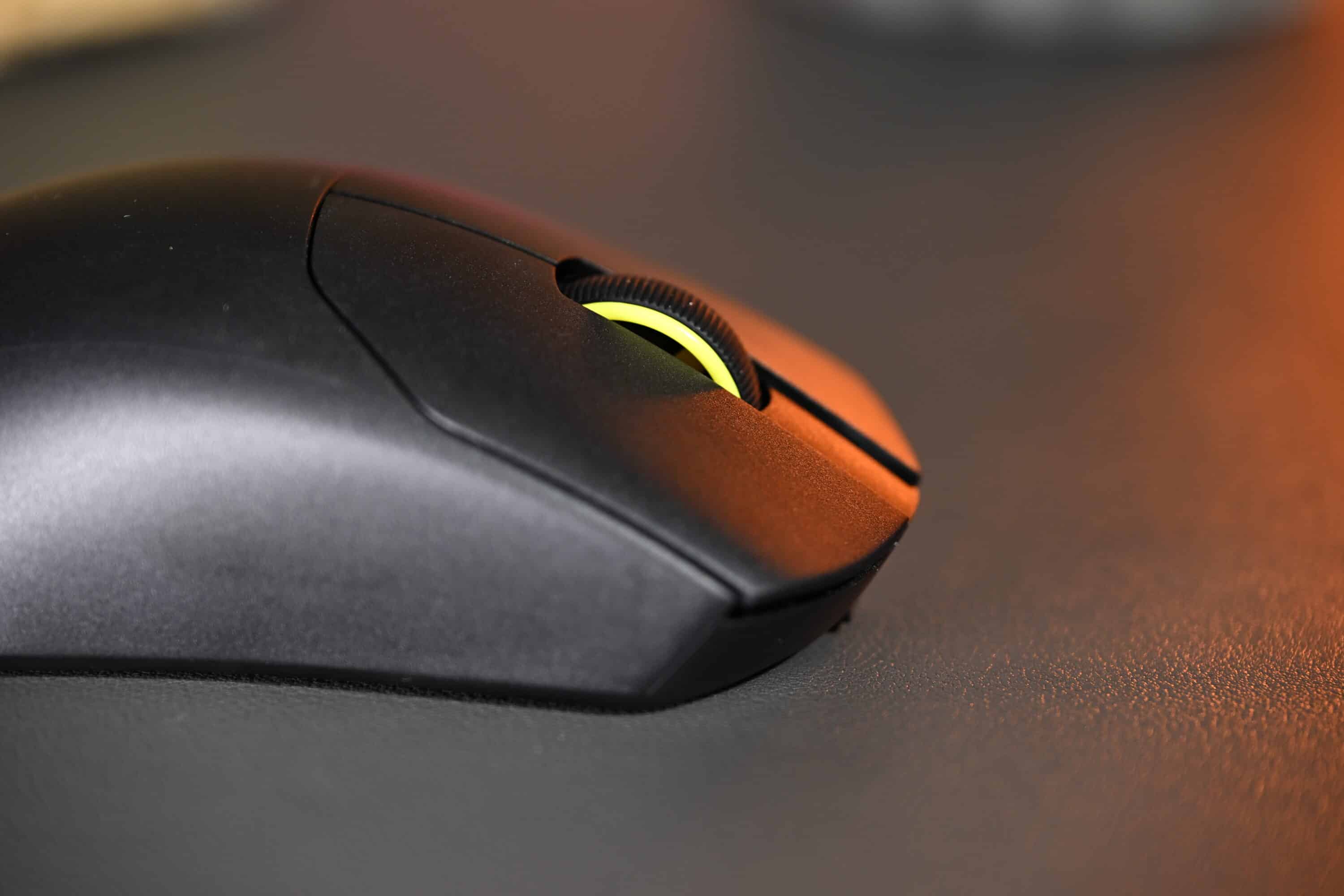 Optisch setzt die Maus auf insgesamt fünf Tasten, zwei davon liegen gut erreichbar an der linken Seite. Das gummierte und hervorragend gerasterte Scrollrad weist einen gelben Rahmen auf beiden Seien auf, auf eine RGB-Beleuchtung verzichtet die Corsair Sabre v2 Pro dabei aber konsequent.