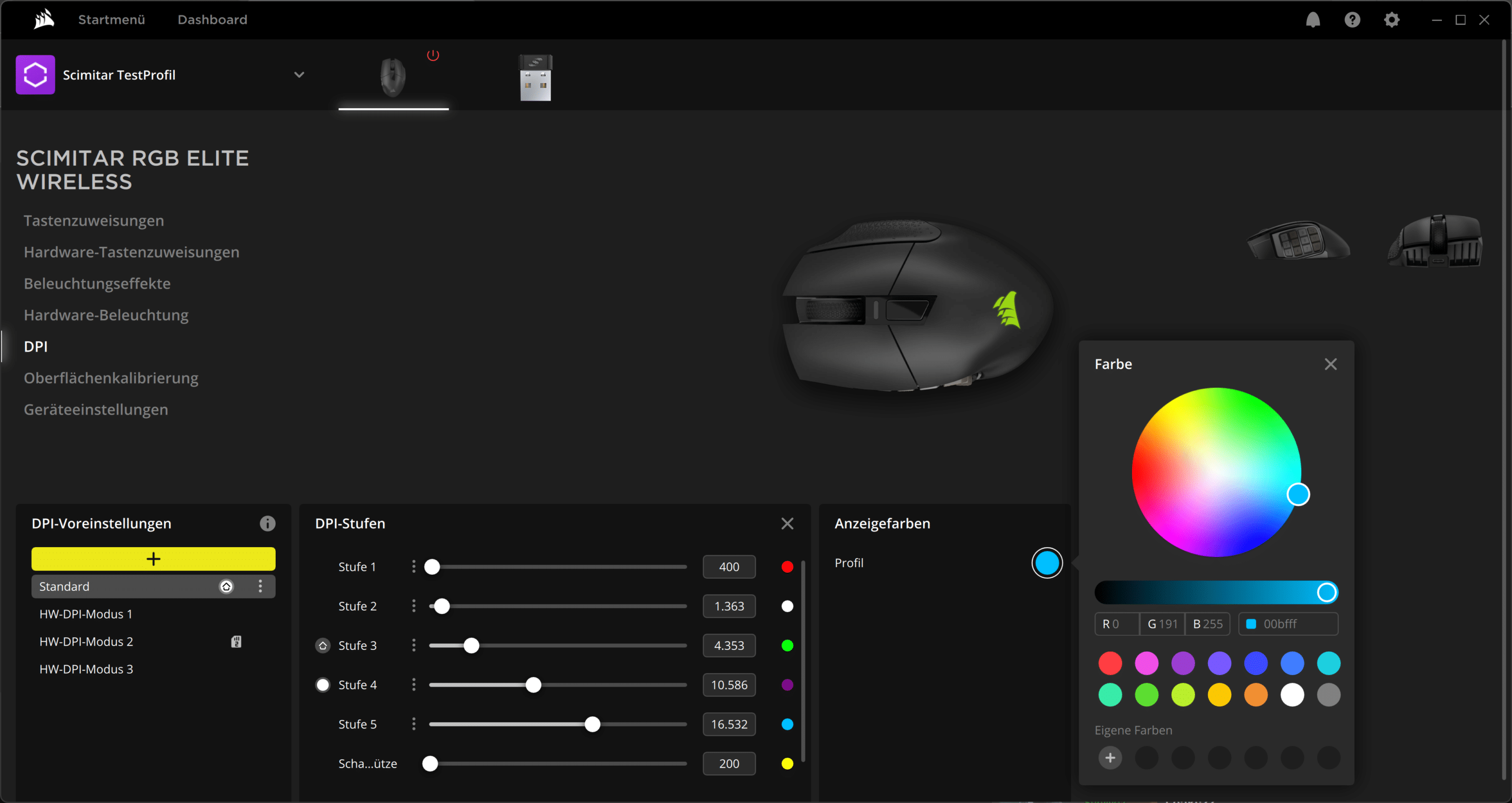Im Fall der Scimitar Elite Wireless werden unter anderem diverse Sensor-Optionen angeboten: In jedem Profil speichert die Maus sechs DPI-Werte, wovon einer für die Sniper-Funktion reserviert ist. Jede Stufe kann dabei auf 1 DPI genau konfiguriert und zudem mit einer eigenen Farbe versehen werden. Diese leuchtet dann beim Wechsel auf – das hat uns gut gefallen.