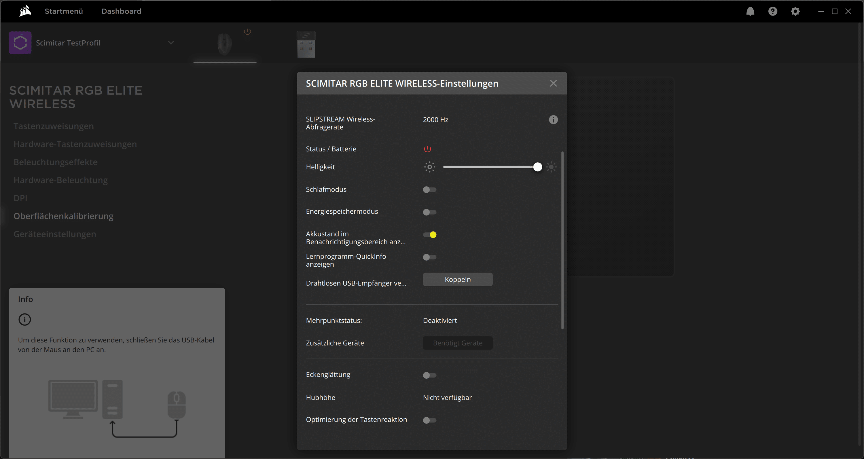 Auch in weiteren Details, etwa bei der Anbindung, hat uns die Maus gefallen. Im Kabelbetrieb wie auch mit beiden kabellosen Modi funktioniert die Maus tadellos. Corsair nennt dabei, ohne Beleuchtung, eine Akkulaufzeit zwischen 120 und 150 Stunden, die wir im Test nicht ausgeschöpft haben. Dafür können wir einen Mindestwert nennen. Mit Regenbogen-Beleuchtung auf maximaler Stufe und der energieintensiveren Slipstream-Verbindung hielt die Maus bei uns rund 30 Stunden durch. Im Vergleich zu anderen beleuchteten Mäusen ist das ein guter Wert. Und mit reduzierter Helligkeit oder gar deaktivierter Beleuchtung dürfte das Modell noch deutlich länger aushalten.