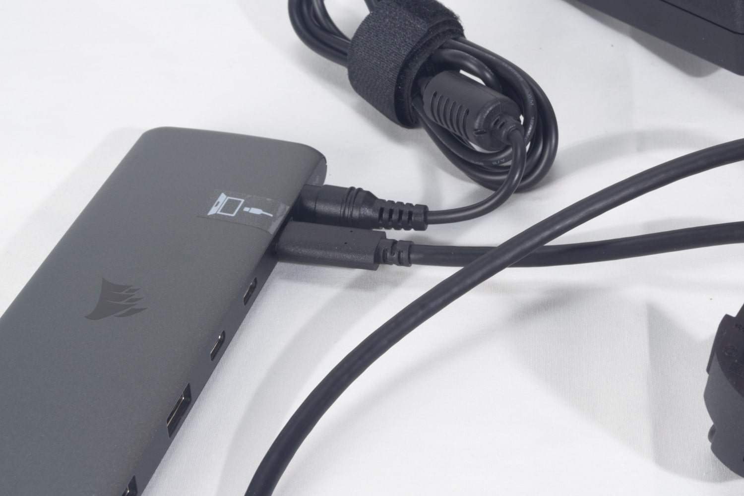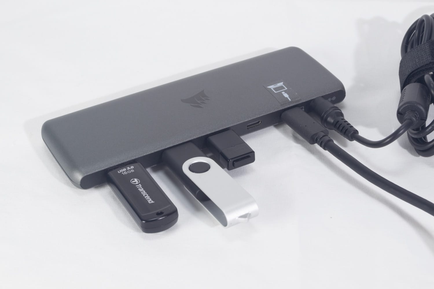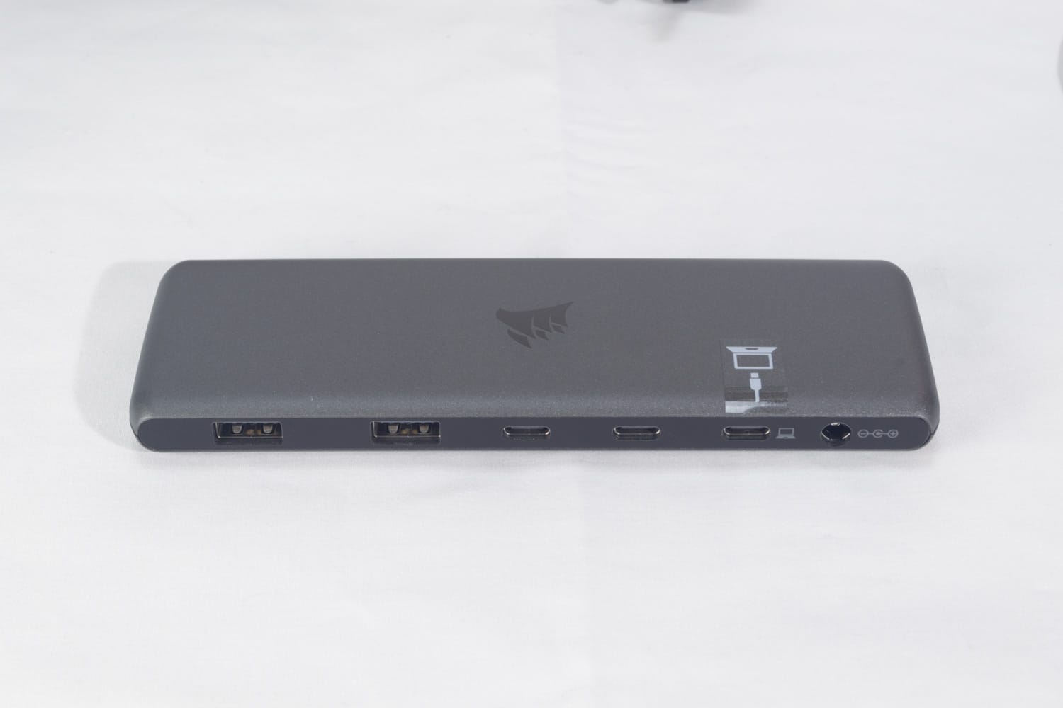 Insgesamt besitzt das Gehäuse des USB100 von Corsair neun Anschlüsse, zu denen wir auch den Stromanschluss und den USB-C-Port für die Verbindung mit dem Hauptgerät (Mac, PC, Laptop) zählen.