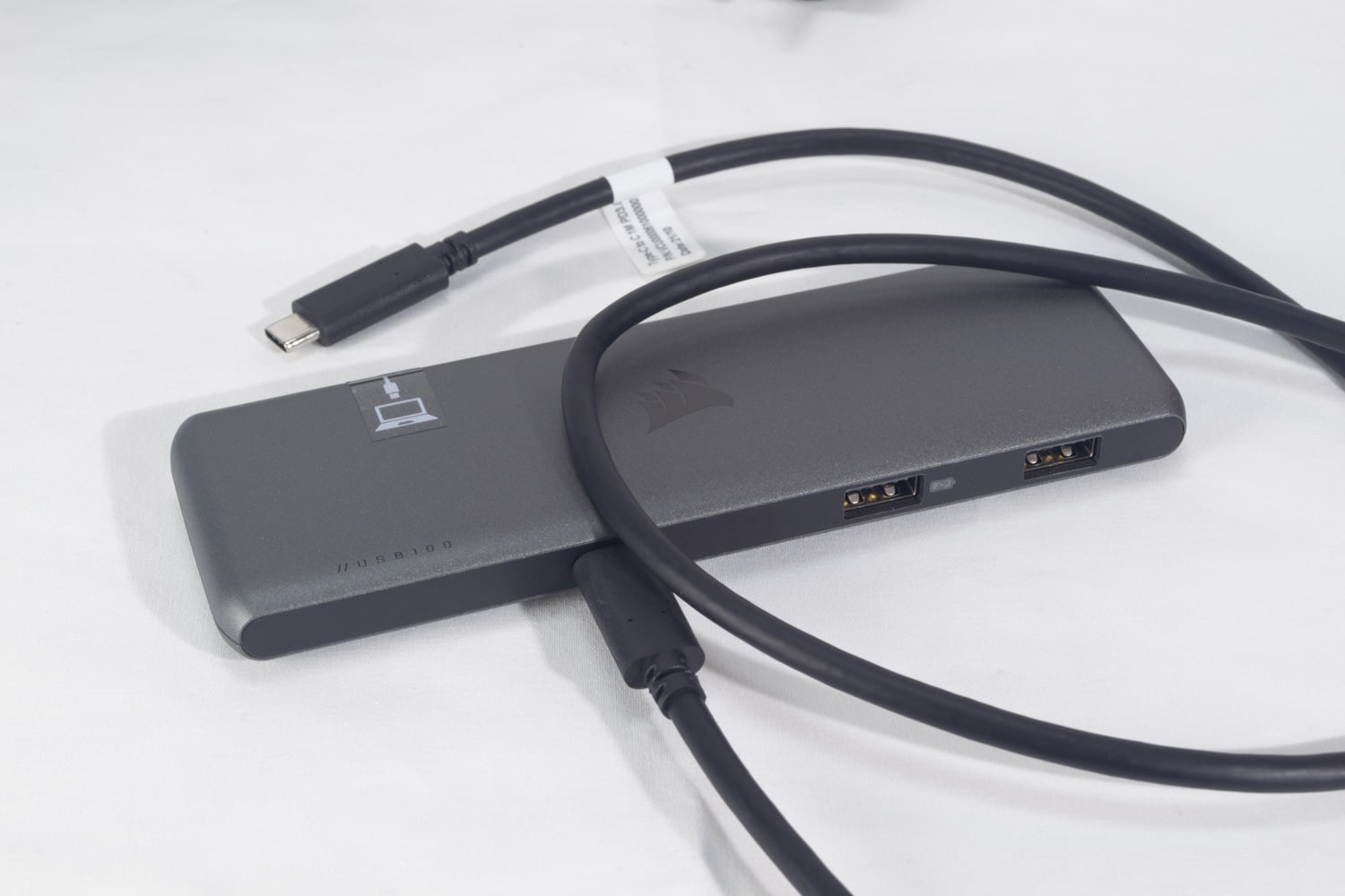 Von den vier USB-Hubs, die Corsair zum Testzeitpunkt anbietet, ist das USB100 das günstigste Modell. Für diesen Preis bietet es insgesamt sieben USB-Ports mit einer schnellen Übertragungsrate von 5 Gigabit pro Sekunde und teilweise erhöhter Leistung von bis zu 15 Watt zum schnellen Laden angeschlossener Geräte. Es kommt außerdem mit eigener Stromversorgung und ist kompatibel mit Mac- und Windows-Systemen.