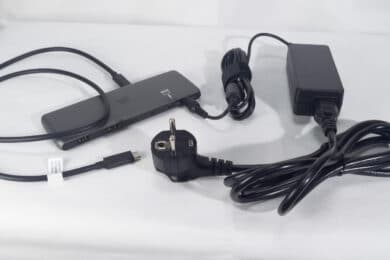 Das 65W-Netzteil ist im Vergleich zum filigranen Hub selbst größer und schwerer. Das gleiche gilt auch für das beiliegende Netzkabel, welches mit etwa 1,70 Meter großzügig bemessen ist und im Notfall problemlos auch für PC oder Monitor genutzt werden könnte. Die Stromversorgung des Hubs ist dementsprechend solide ausgestattet und lässt nichts zu wünschen übrig.