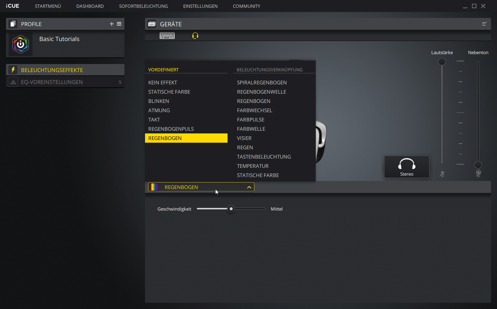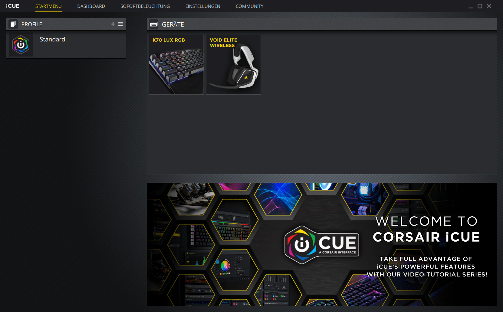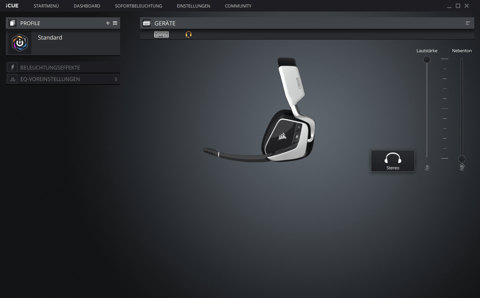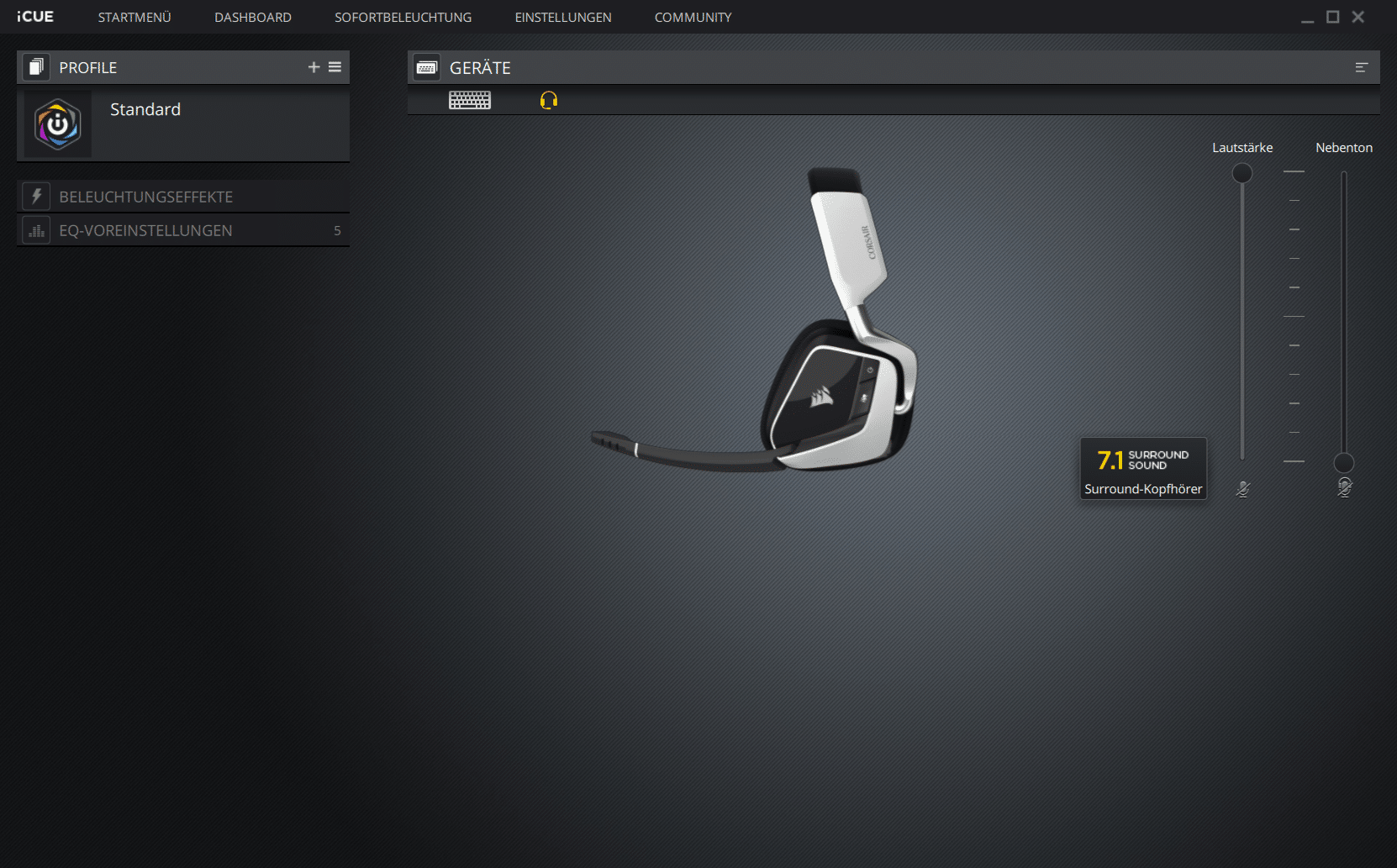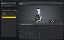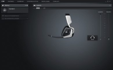 Als Software kommt iCUE zum Einsatz. Hierin kann die Beleuchtung geregelt und unter anderem mit anderer Corsair-Hardware abgestimmt werden. Ferner bieten sich diverse Möglichkeiten, Einfluss auf den Klang zu nehmen. So sind etwa mehrere Equalizer-Profile voreingestellt, die verändert oder durch eigene Profile ergänzt werden können. Darüber hinaus lässt sich in der Software der virtuelle Surround-Sound aktivieren, der alternativ über das Drehelement an der linken Ohrmuschel eingeschaltet werden kann.