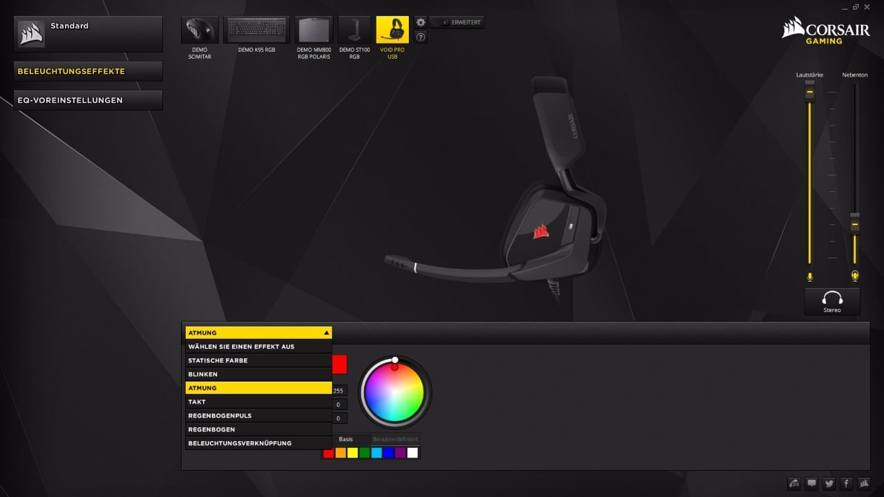 Wenn ihr das Corsair Void Pro aufruft, könnt ihr in der Hauptansicht mittig den Ein- sowie Ausgangspegel einstellen. Über den großen Button darunter kann der Surround-Sound angeschaltet werden. Die restlichen Einstellungen sind in die Bereiche „Beleuchtungseffekte“ und „EQ-Voreinstellungen“ unterteilt. Im Bereich des Equalizers können fünf verschiedene Voreinstellungen gewählt werden, die aber noch individuell angepasst werden können. Klasse ist auch, dass ein Programm einem bestimmten Profil zugeordnet werden kann.