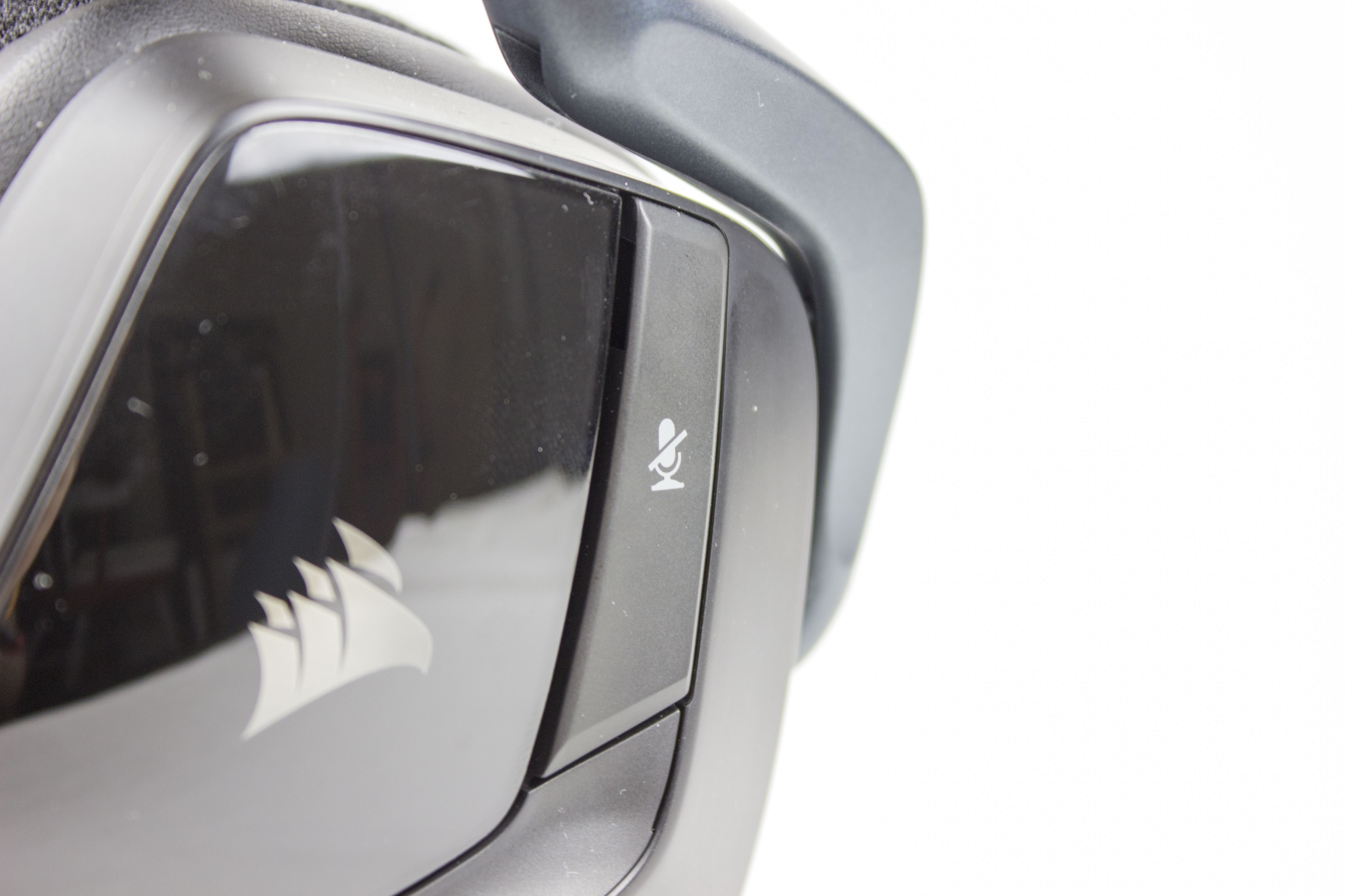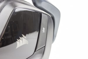Auch das Gehäuse der Ohrmuscheln macht einiges her. Durch die Verwendung von matten und glänzenden Oberflächen machen sie einen hochwertigen Eindruck. Auf der linken Ohrmuschel, dort wo auch das Mikrofon angebracht ist, sind auch die Steuerelemente wie der Lautstärkeregler und der Button zum Stummschalten des Mikrofons angebracht. An beiden Ohrmuscheln befindet sich außerdem das Corsair-Logo, das sich mit bis zu 16,8 Millionen verschiedenen Farben beleuchten lässt.