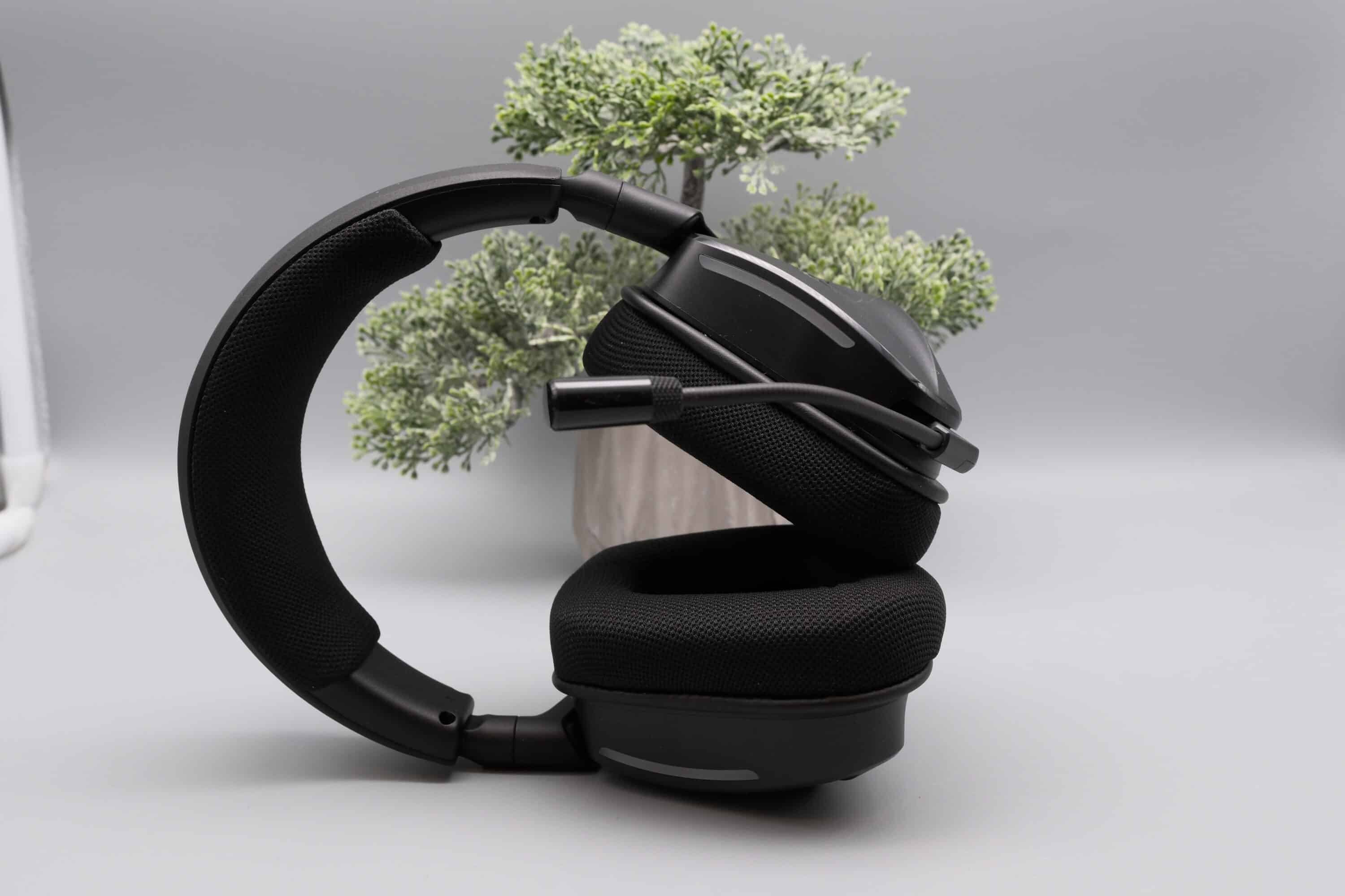 Mit einem Gewicht von 295 Gramm ist das Gaming-Headset relativ leicht und realisiert, auch dank der großzügigen Ohrpolster, die 25 mm dick sind, einen hervorragenden Tragekomfort. Auch das weiche Stoff-Kopfband fällt sehr weich und großzügig aus, sodass das Gewicht des Headsets angenehm auf dem Kopf verteilt wird.