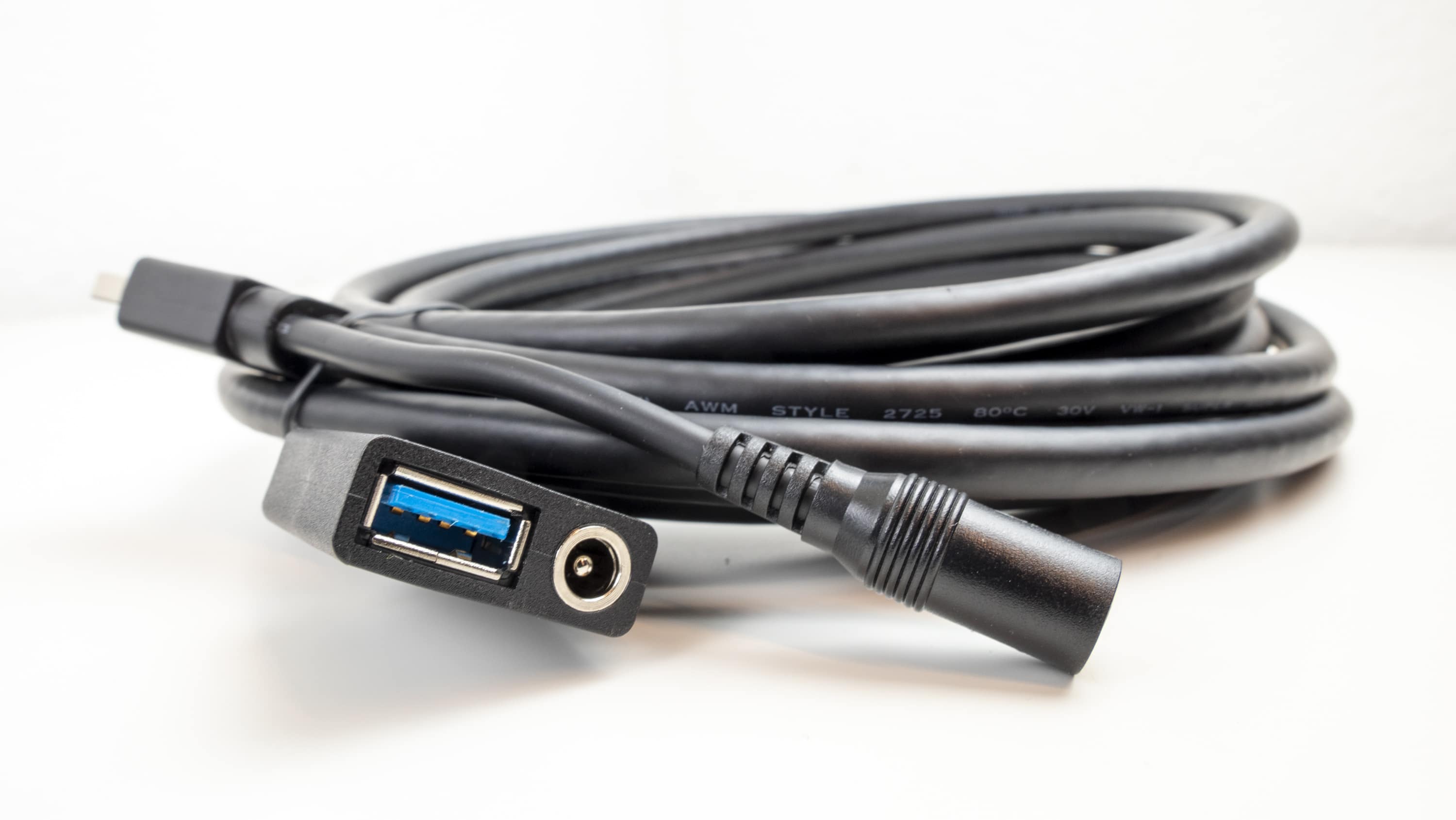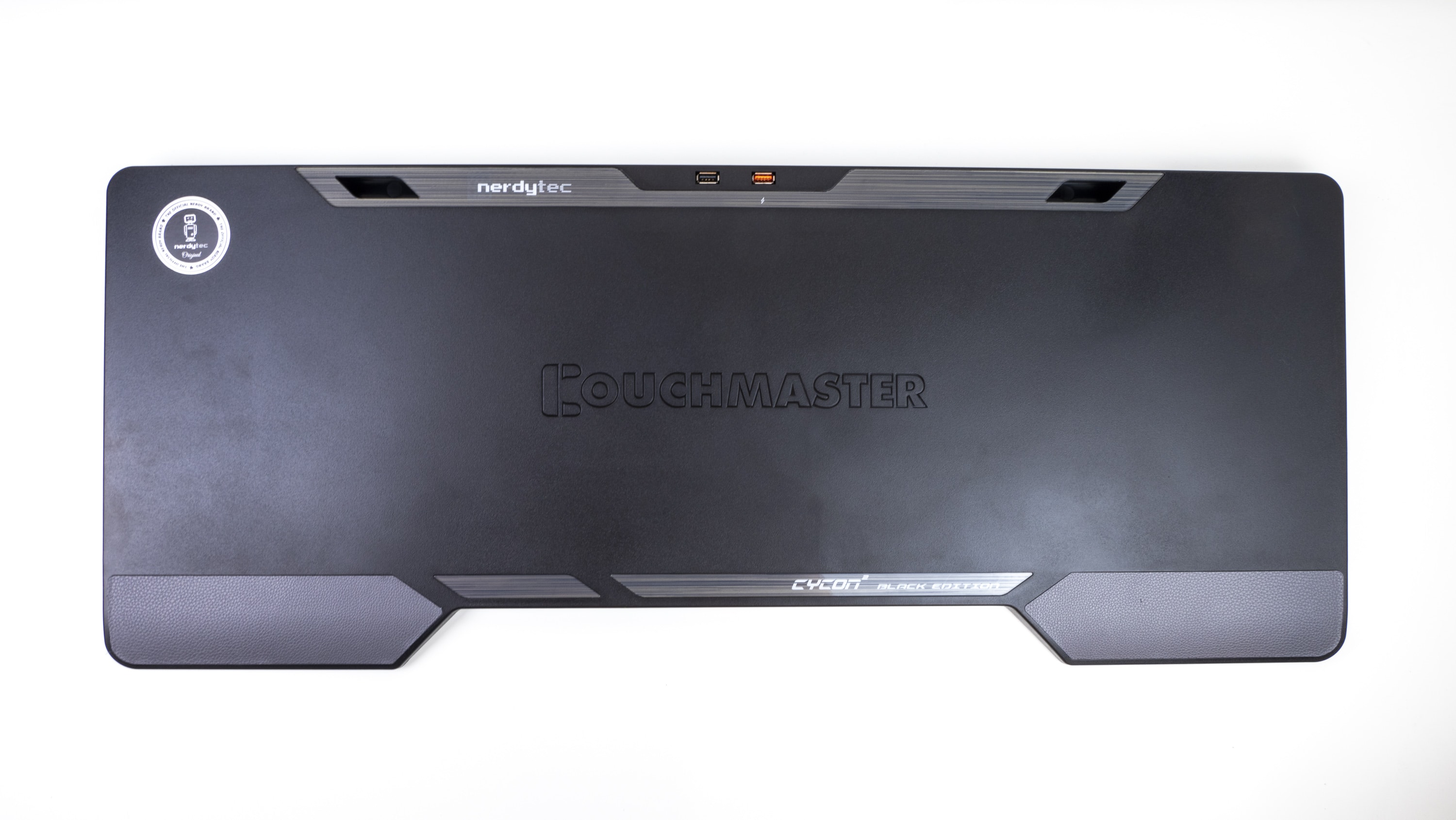 Die gummierte Auflage sieht aber nicht nur gut aus, sondern verfügt auch über einige Anschlüsse. Um diese mit genug Strom zu versorgen, bekam der Couchmaster CYCON2 ein eigens für nerdytec entwickeltes Stromkabel verpasst. Damit kriegen alle Geräte, die nicht mehr als 900 mA benötigen, genug Saft. Das Kabel ist nur 0,8 Meter lang, daher gibt es noch ein 5 Meter langes Verlängerungskabel.