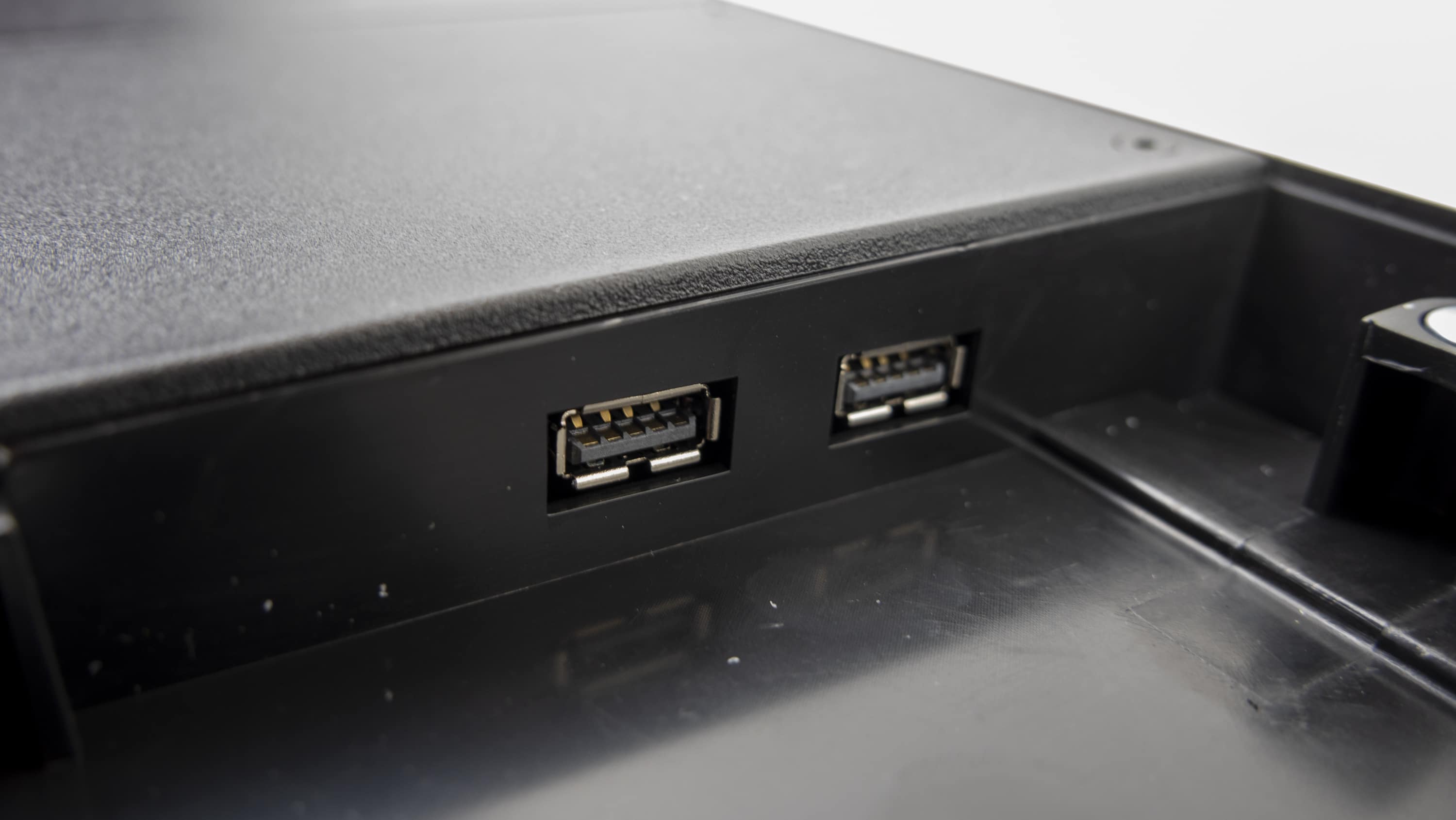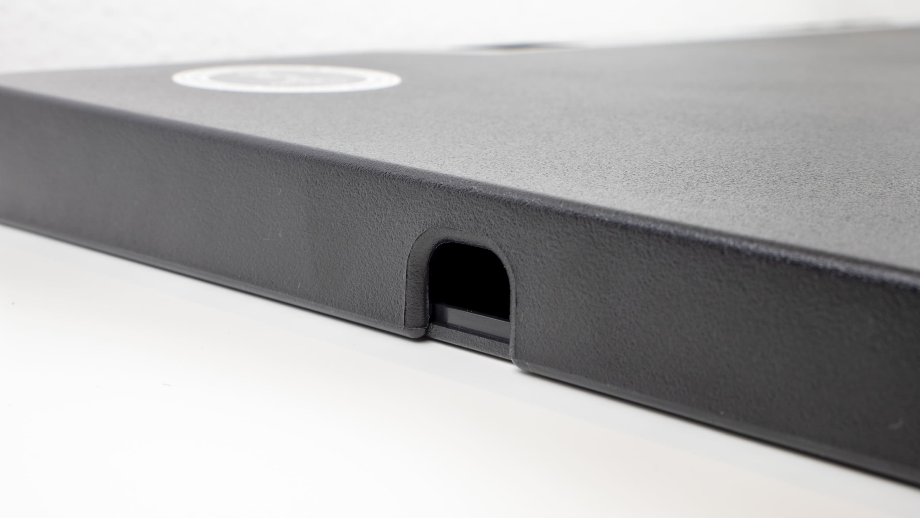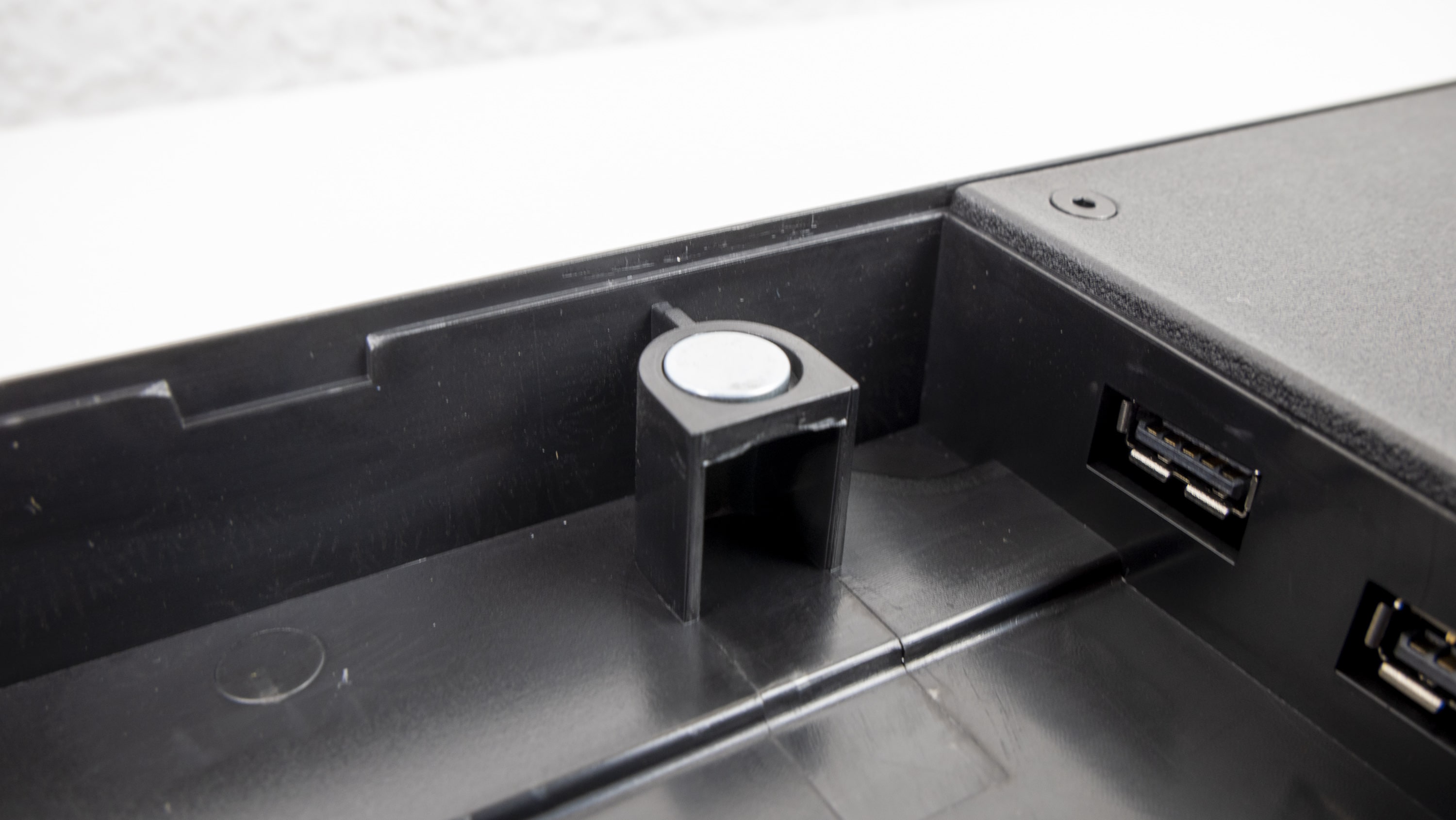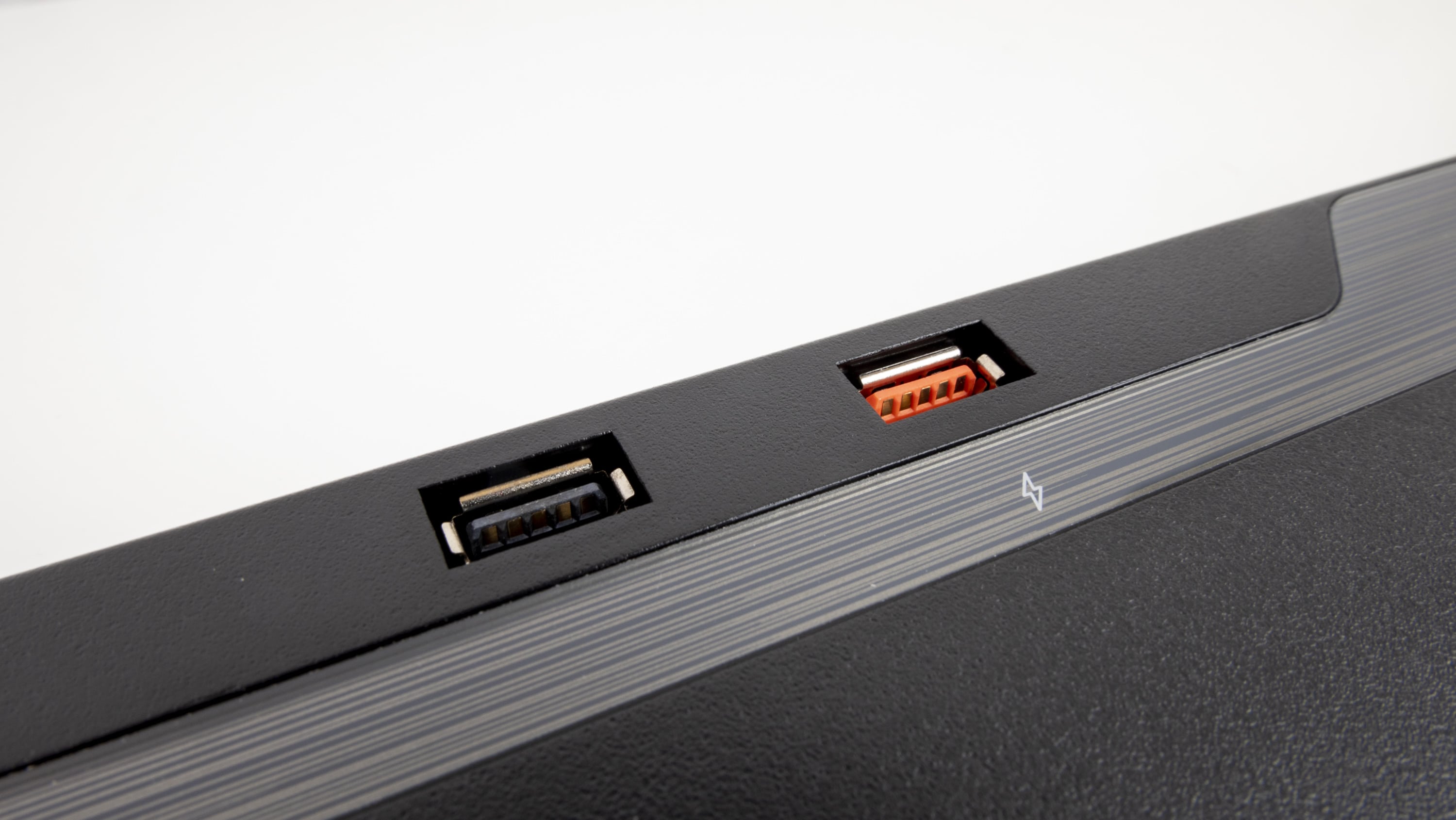 Ausgestattet wurde der Couchmaster CYCON2 mit insgesamt sechs USB-3.0-Ports. Dabei befinden sich zwei sichtbar an der Oberseite der Auflage, wovon einer sich auch zum Schnelladen eignet. Die restlichen vier sind innenliegend. An ein optimales Kabelmanagement wurde also auch gedacht. Sämtliche Kabel verschwinden durch zwei Löcher links und rechts neben den außenliegenden USB-Ports. Zwei Klappen an der Unterseite stellen den Zugang zum Kabelmanagement her. Dort kann bequem angesteckt und verstaut werden. Die Klappen selbst werden anschließend mit Neodym-Magneten geschlossen gehalten. Diese widerstehen auch wilden Rucklern beim intensiven Zocken. Wem das nicht reicht, kann die beiliegenden Sicherheitsschrauben verwenden, was wir empfehlen.