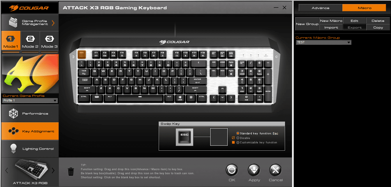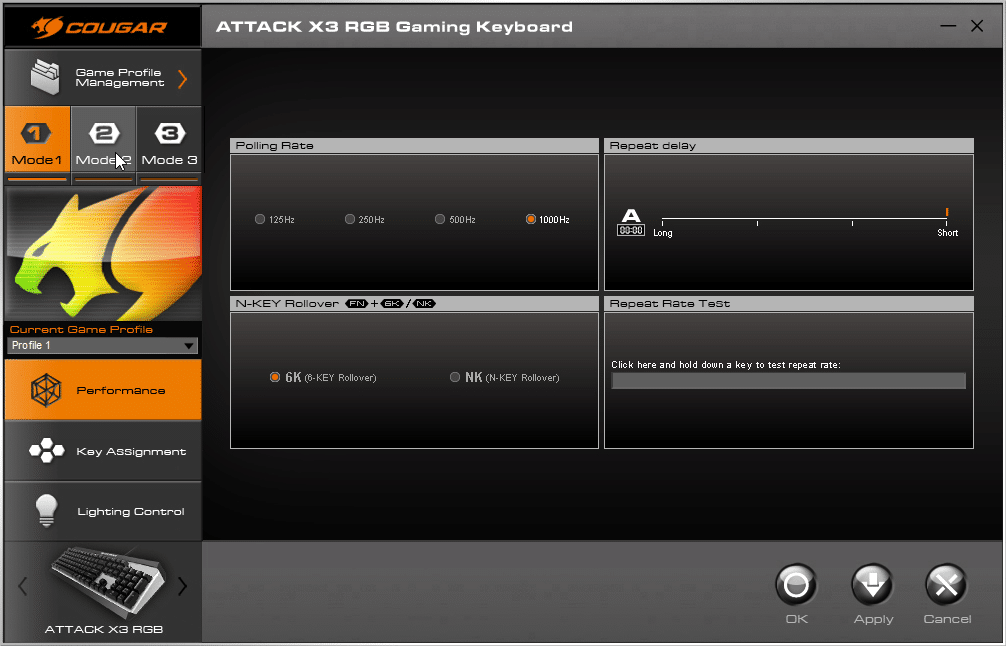 Unter dem Reiter „Performance“ könnt ihr einmal ein 6-Key Rollover oder ein N-Key Rollover einstellen. Natürlich habt ihr auch hier die Möglichkeit Makros auf die Tasten zu programmieren. Jedoch gibt es bei der Cougar Attack X3 RGB keine extra „Makro Tasten“.