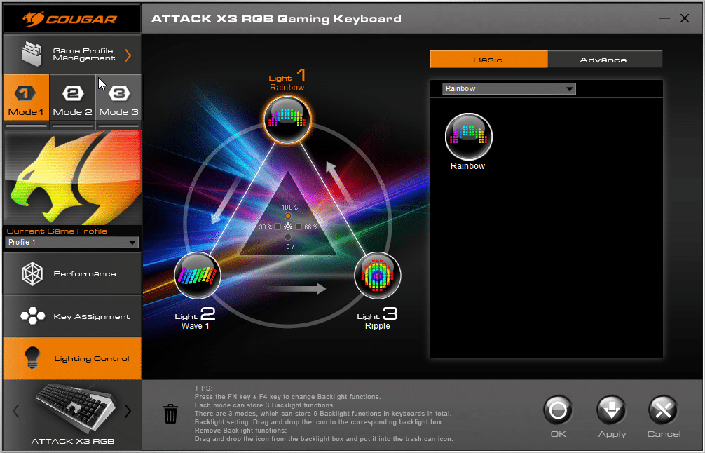 Wie bei fast jeder Tastatur gibt es bei der Cougar Attack X3 RGB auch eine Software, mit der ihr verschiedene Sachen, wie zum Beispiel die Helligkeit und Makros, einstellen könnt. In der Software könnt ihr die Polling-Rate von 125 Hz bis 1000 Hz einstellen. Jedoch empfehle ich 1000 Hz einzustellen, da ihr damit 1 Millisekunde Verzögerung habt. Bei der RGB-Variante habt ihr noch mehrere Einstellungsmöglichkeiten der Beleuchtung. Dort könnt ihr drei Einstellungen auswählen und diese mit der FN + F4 Taste umstellen.