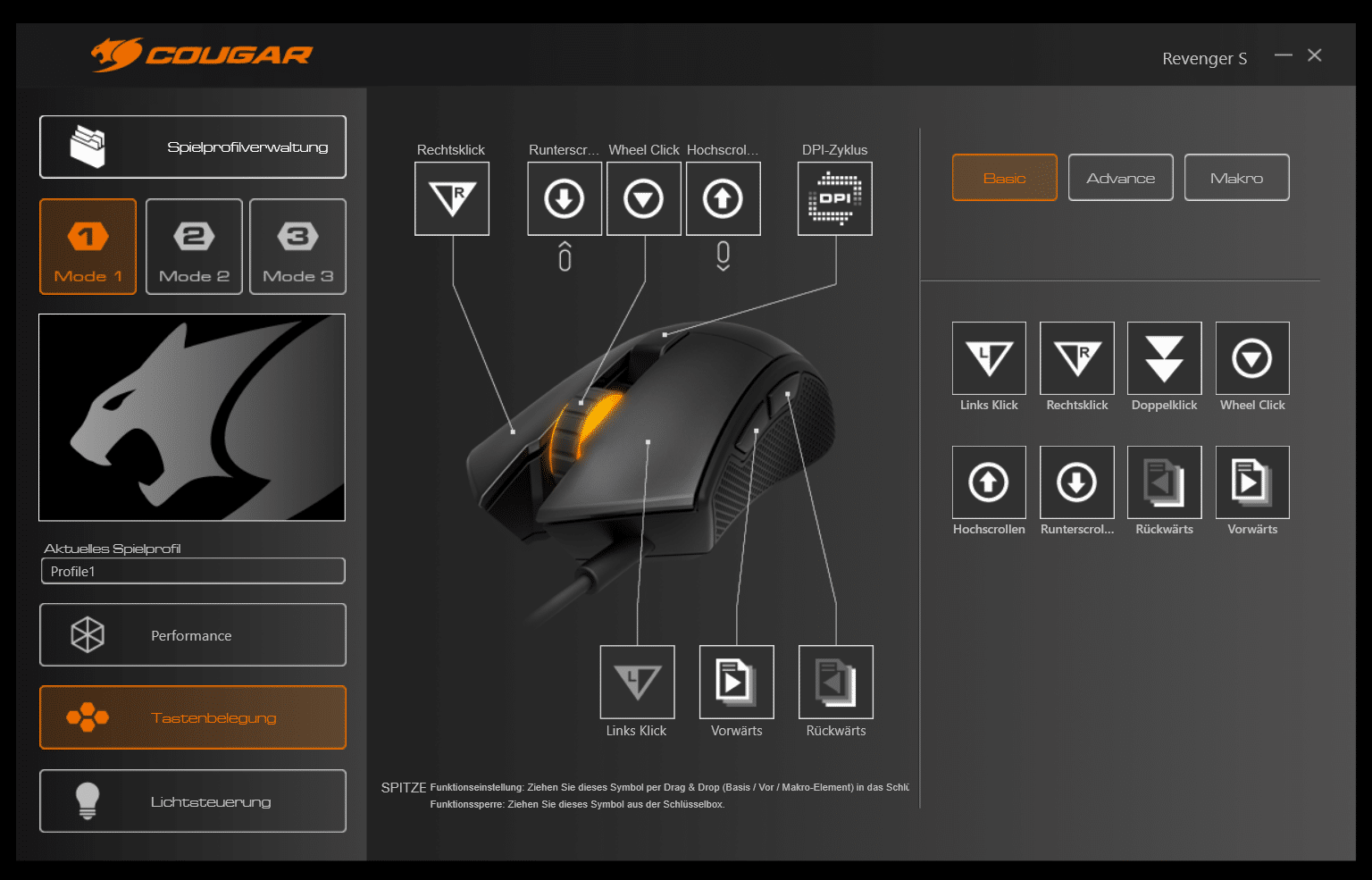 Unterteilt in die Kategorien „Performance“, „Tastenbelegung“ und „Lichtsteuerung“ können sämtliche Funktionen der Maus individualisiert und in drei Profilen gespeichert werden.