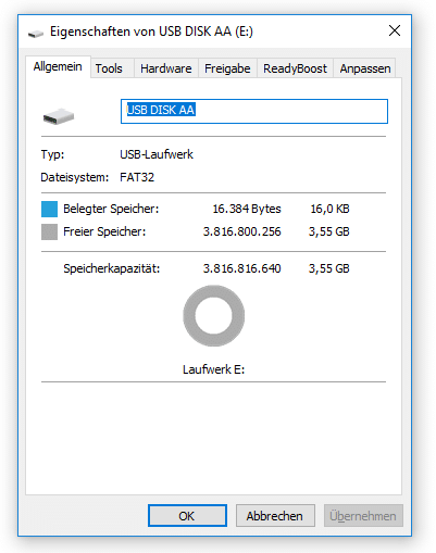 Hauptfeature des Outlier One Plus ist der integrierte MP3-Player. Um Musik auf das Gerät überspielen zu können, muss dieser per USB an einen PC angeschlossen werden. Unter Windows 10 wurde es direkt als USB-Speicher erkannt. Von den versprochenen 4 GB stehen ca. 3,55 GB zur Verfügung.