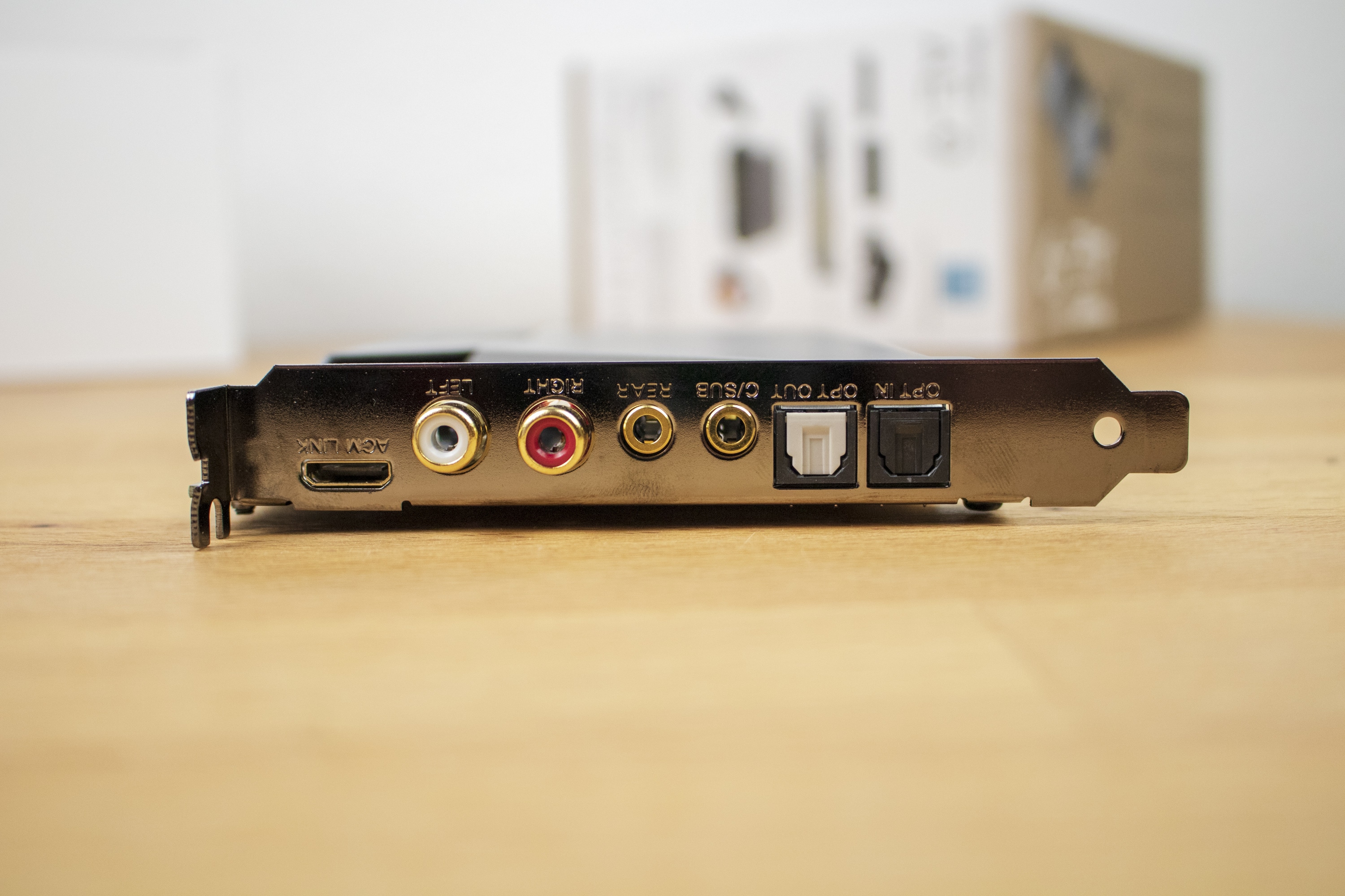 1x optischer TOSLINK-Eingang, 1x optischer TOSLINK-Ausgang, 1x 3.5mm Rear Out, 1x 3.5mm Center/Sub Out, 1x ACM-Verbindung, 1x 6-poliger PCI-Express (PCI-E) Stromanschluss (erforderlich für ACM), 2x Cinch (L/R) Frontausgang Audio Control Module (ACM): 2x RCA (L / R), 1 x 3,5 mm Mic In (Mono), 1x 3,5 mm HP-Ausgang, 1x 6,3 mm HP-Ausgang, 1x XLR-Eingang |