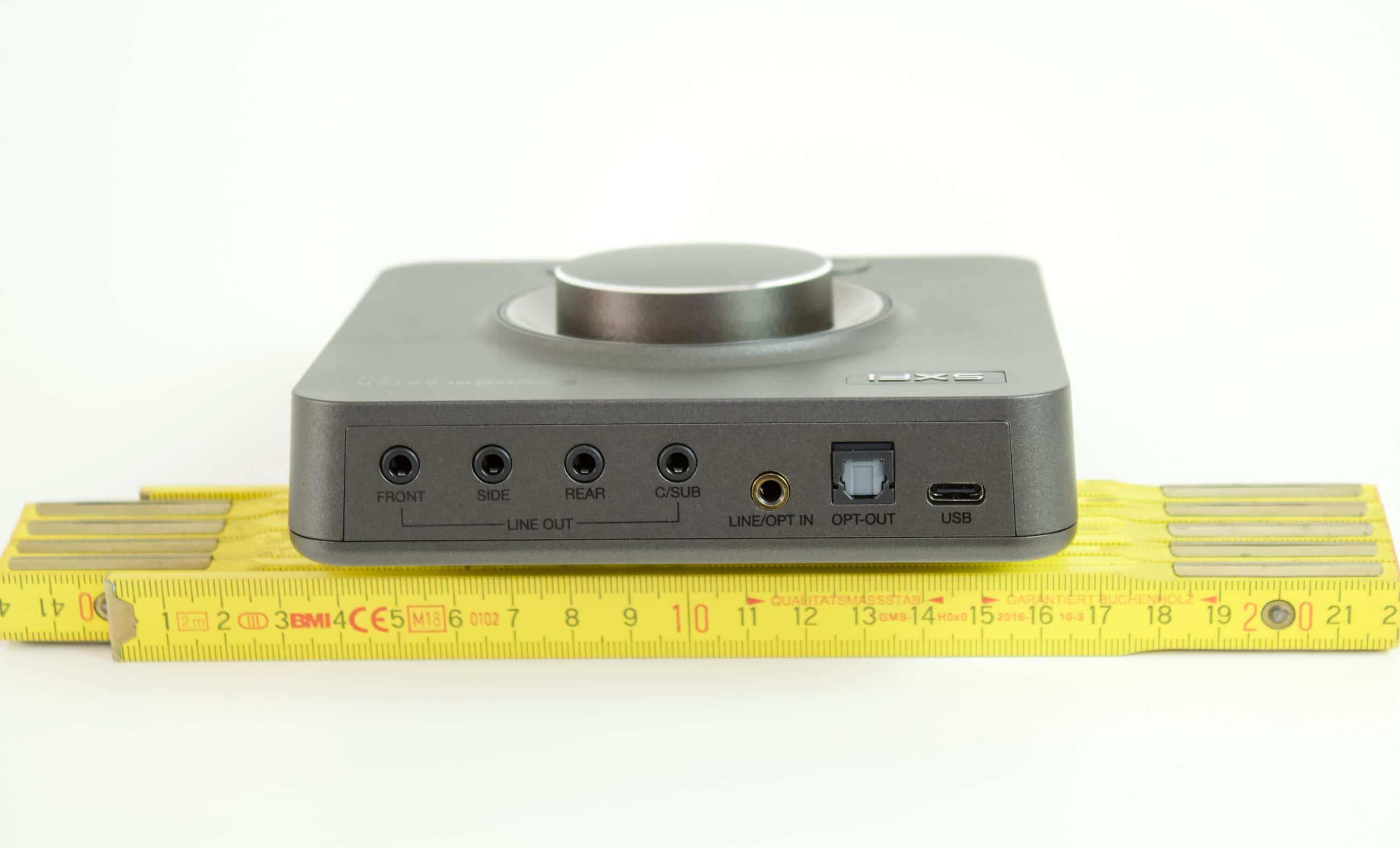Auf der Rückseite befindet sich die Stromversorgung über USB Typ C. Beim Anschluss der Soundkarte kann entweder direkt USB genutzt werden, oder ein Line-IN-Eingang, der nun etwas tiefer im Vergleich zum Vorgänger platziert wurde. Zudem befinden sich hinten vier Line-OUT als auch ein optischer Ausgang.