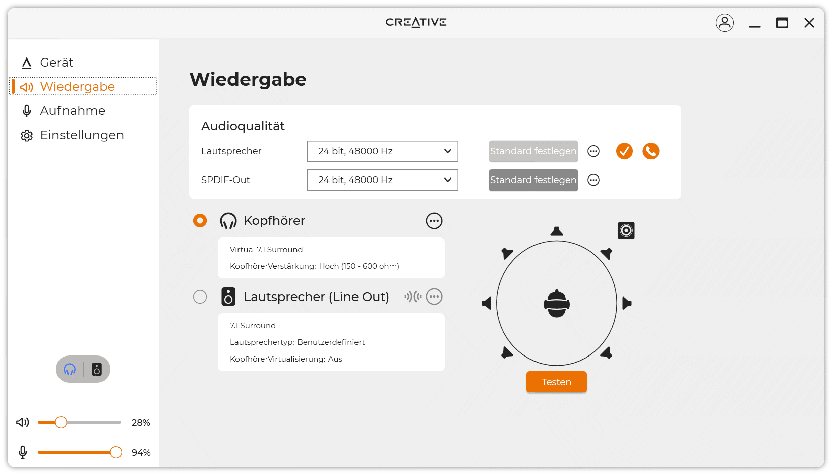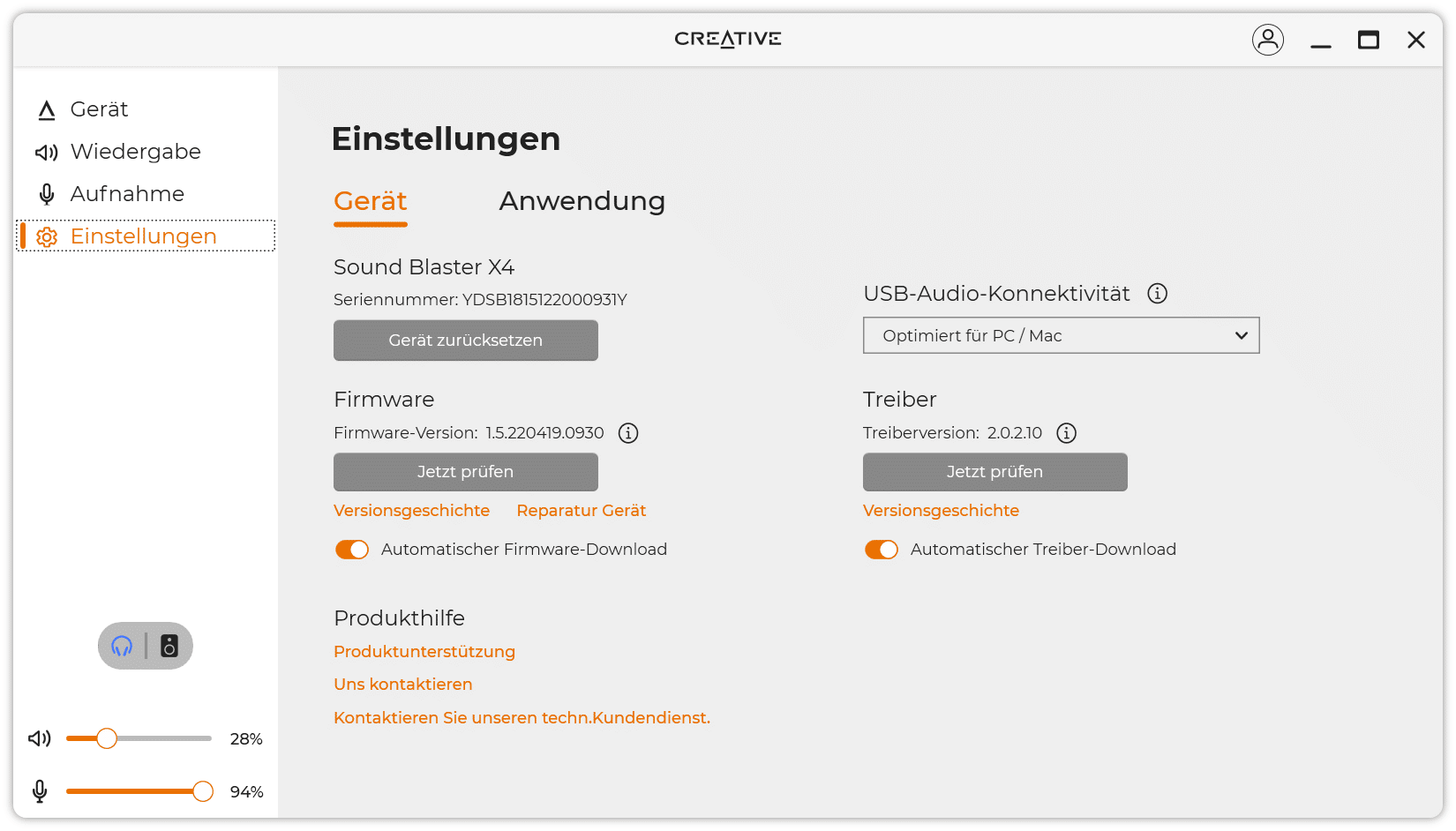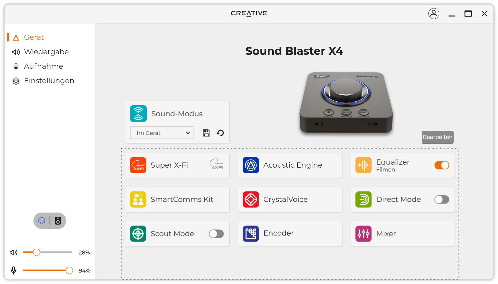 Wird die Sound Blaster X4 an einem Windows-Rechner betrieben, so kann die Creative-App genutzt werden. Mit dieser Software können verschiedene Einstellungen getroffen werden.