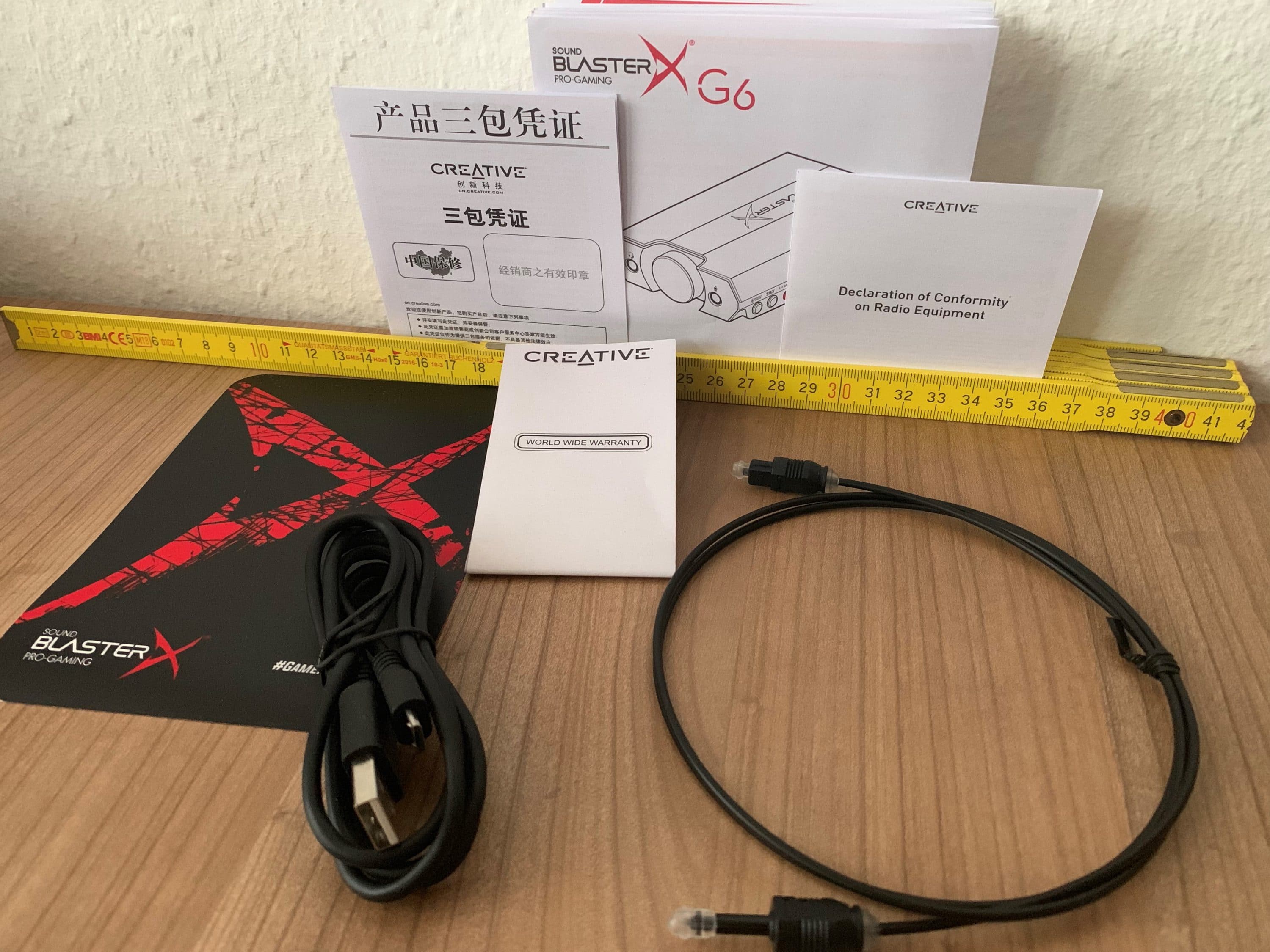 Der Sound BlasterX G6 wird in einer leicht mit Schaumstoff gepolsterten Verpackung geliefert. Im Lieferumfang befindet sich neben der Soundkarte auch folgendes: