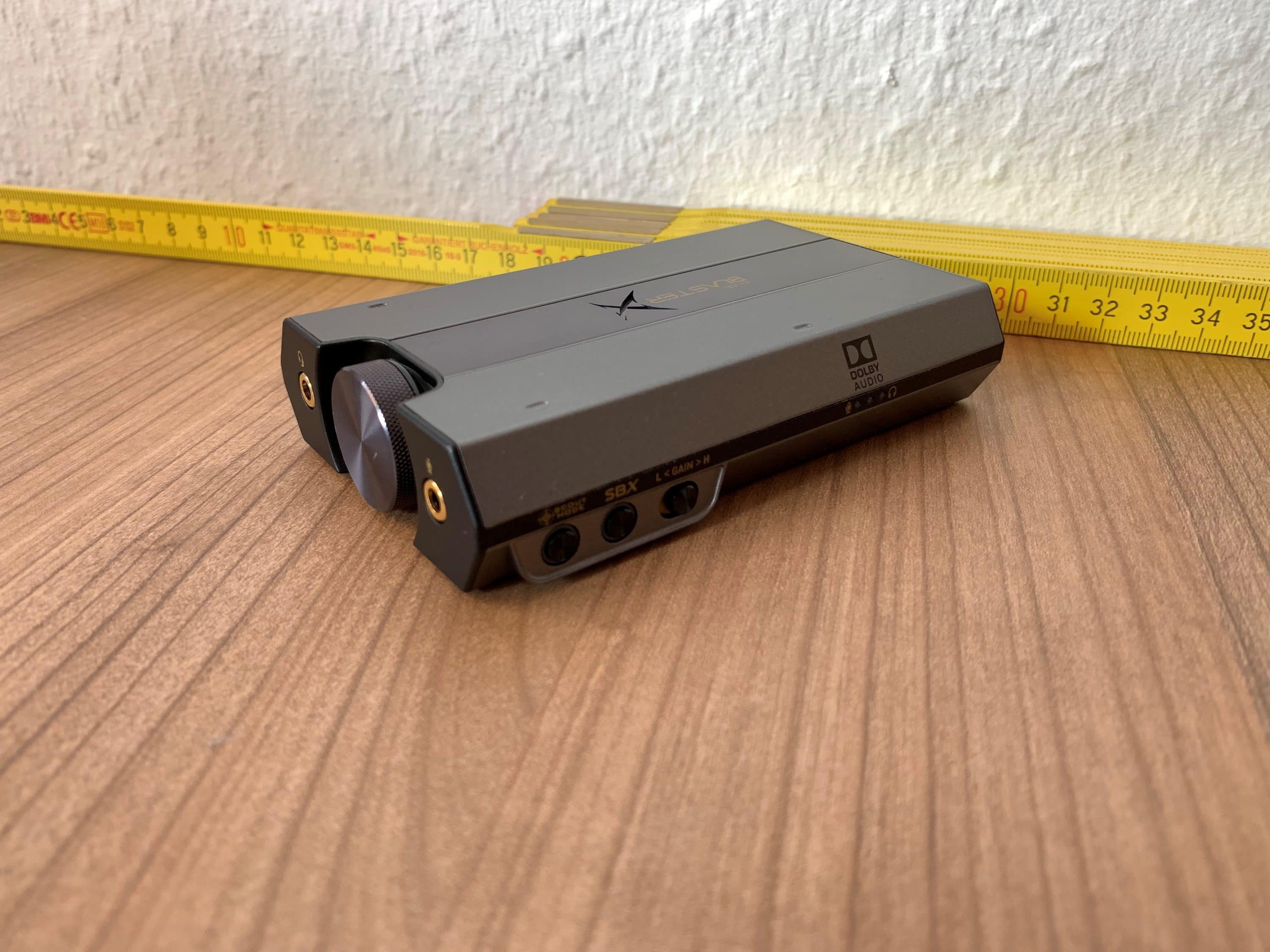 Auf der rechten Seite des Sound BlasterX G6 befindet sich Schalter für den Scout- und Directmodus, ein SBX-Schalter um zwischen Soundprofilen zu wechseln und ein Gain-Schalter zur Einstellung des Kopfhörer-Verstärkers. Über drei LEDs werden verschiedene Statis angezeigt.