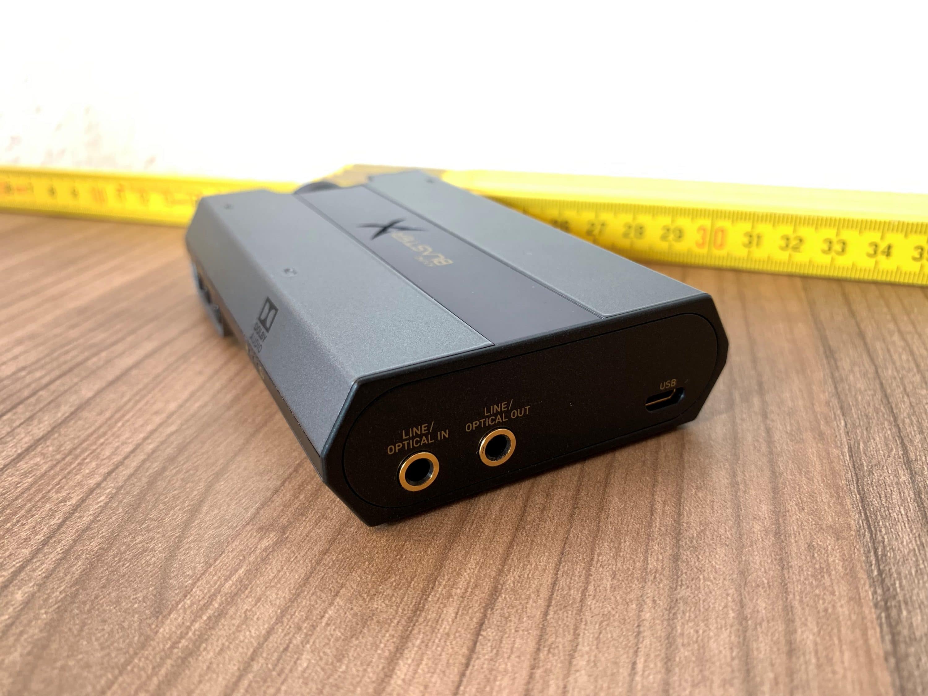 Auf der Rückseite befindet sich die Stromversorgung über Micro-USB. Beim Anschluss der Soundkarte an einem PC oder einer PS4 dient dieser Anschluss auch der Übertragung von Daten. Zudem befindet sich hinten je eine Line- und Mini-Toslink-Kombibuchse (Ein- & Ausgang). Der USB-Anschluss des Vorgängers G5 entfällt.