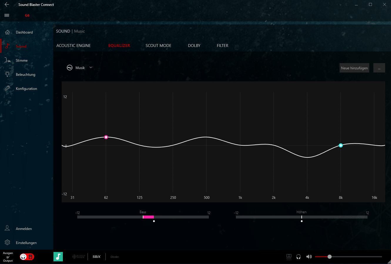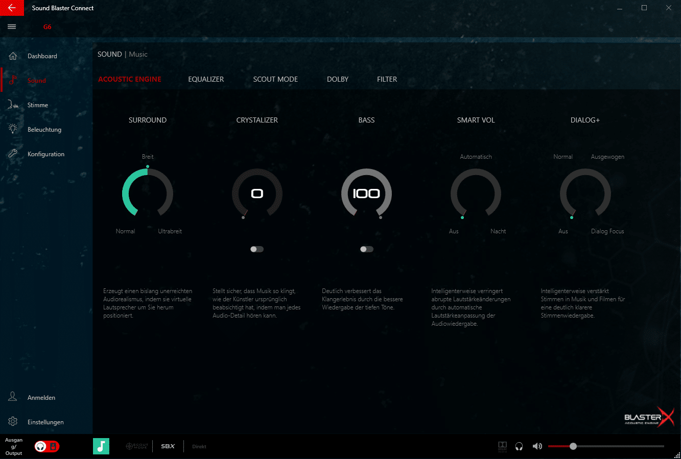 Wird die Sound BlasterX G6 USB-Soundkarte an einem Windows-Rechner betrieben, so kann die Sound Blaster Connect Software genutzt werden. Mit dieser Software können verschiedene Einstellungen getroffen werden.