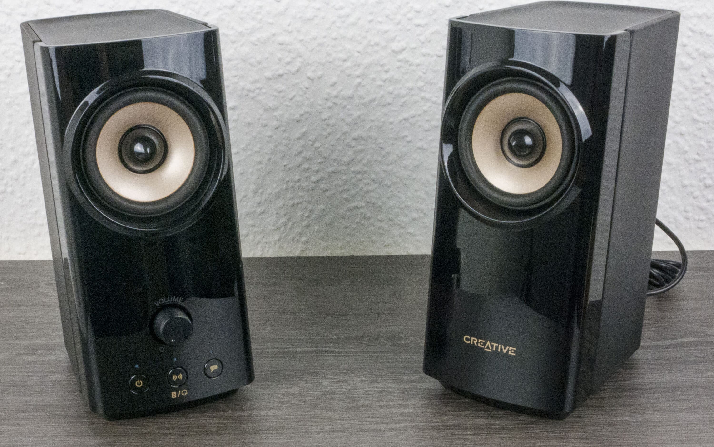 Das Design der Creative T60 Desktop-Lautsprecher ist recht schlicht gehalten. Das mattschwarze Gehäuse ist nur auf der Frontseite zu glänzendem Schwarz übergangen. Hier zeigen sich gerade um die Knöpf daher schnell erste Abdrücke. Die einzigen Farbakzente bieten die Membranen und die Knöpfe, sowie auch der „CREATIVE“-Schriftzug auf der rechten Box, die in einem leichten Bronzeton farblich abgehoben sind. Ansonsten gibt es keine herausstechenden Designelemente, außer eben, dass die Membranen selbst offen liegen. Das gefällt bestimmt nicht jedem, aber so bekommen die T60 designtechnisch etwas Besonderes mit auf den Weg.