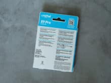 Die Crucial X9 Pro kommt in einem kompakten und überwiegend grauen Karton, dessen Design dem der X10 Pro entspricht. Auf der Vorderseite ist die graue X9 Pro abgebildet. Weiterhin nennt Crucial die Kapazität, die maximalen Übertragungsgeschwindigkeiten und verweist auf die die 5-jährige Garantie sowie Besonderheiten wie den Wasser-, Staub, und Passwortschutz.