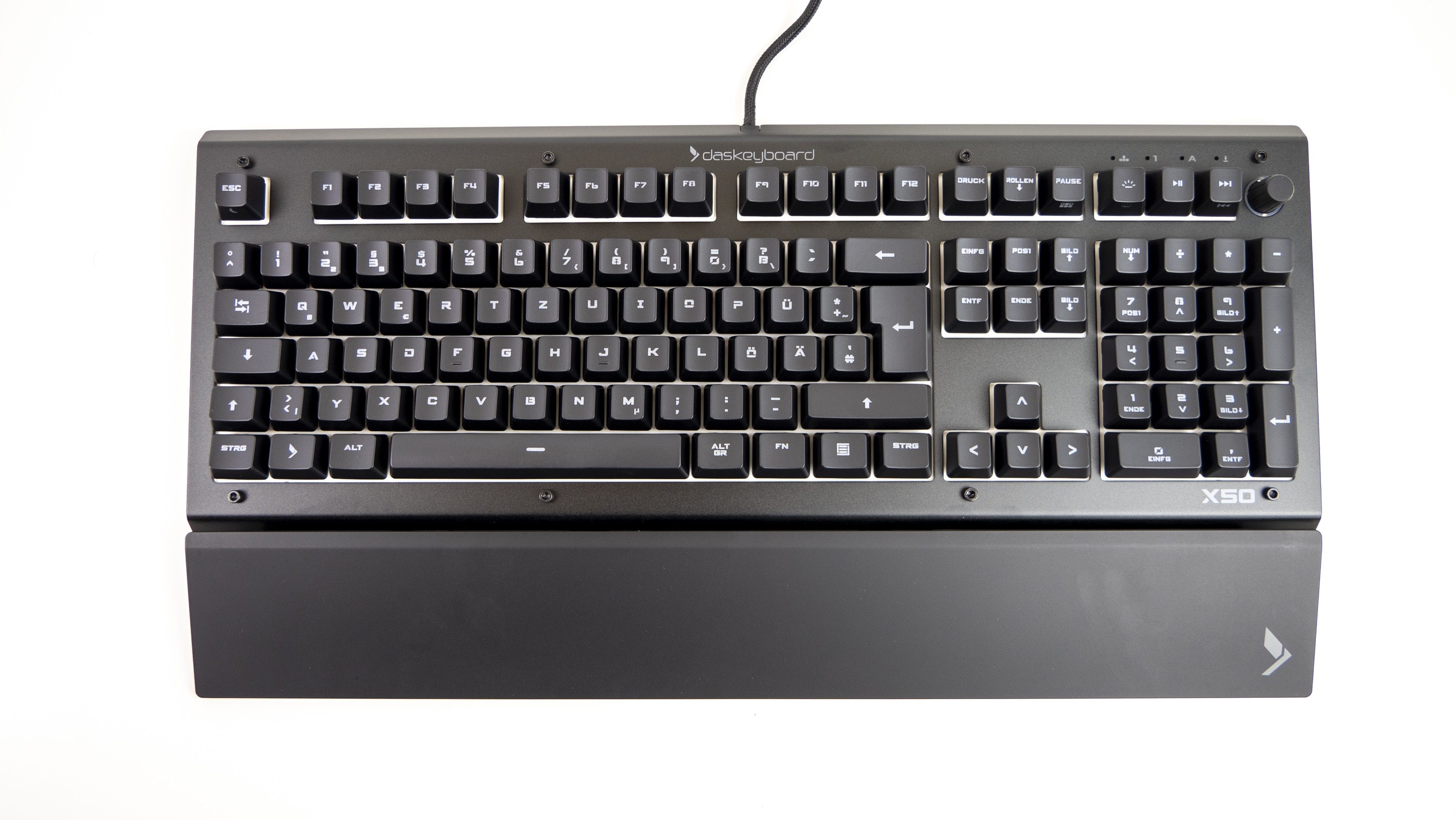 Das Logo mit samt Schriftzug prangt in einem edlen Grau mittig über den F-Tasten, wodurch Das Keyboard X50Q Markenfeeling aufkommen lässt – obwohl es noch eher als Geheimtipp gilt. Zusammen mit dem „X50“ unter dem Num-Block und dem Logo in der rechten Ecke der Handballenauflage, wird die Tastatur zwar gekennzeichnet, jedoch nicht übertrieben oder gar belästigend. Das elegante Aussehen bleibt davon unberührt.