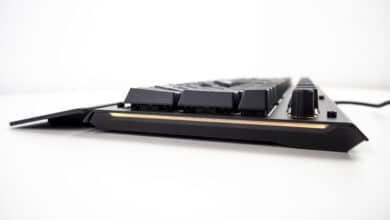 Insgesamt wurden drei solcher Keys verbaut. Am meisten fällt dabei der Drehregler auf, mit dem sowohl Lautstärke als auch die RGB-Helligkeit gesteuert werden kann. Letzteres ist besonders beim Spielen oder anderen Tätigkeiten ein nützliches Feature, da weder Tastenkombinationen noch Programmwechsel vonnöten sind. Um den Regler für die RGB-Beleuchtung zu verwenden, nutzt man zuvor die entsprechende Taste neben den Medientasten. So weiß der Regler, ob Licht oder Lautstärke gesteuert werden soll. Eine weitere Funktion nimmt der Regler zudem noch ein, worauf wir allerdings im Part Software eingehen.