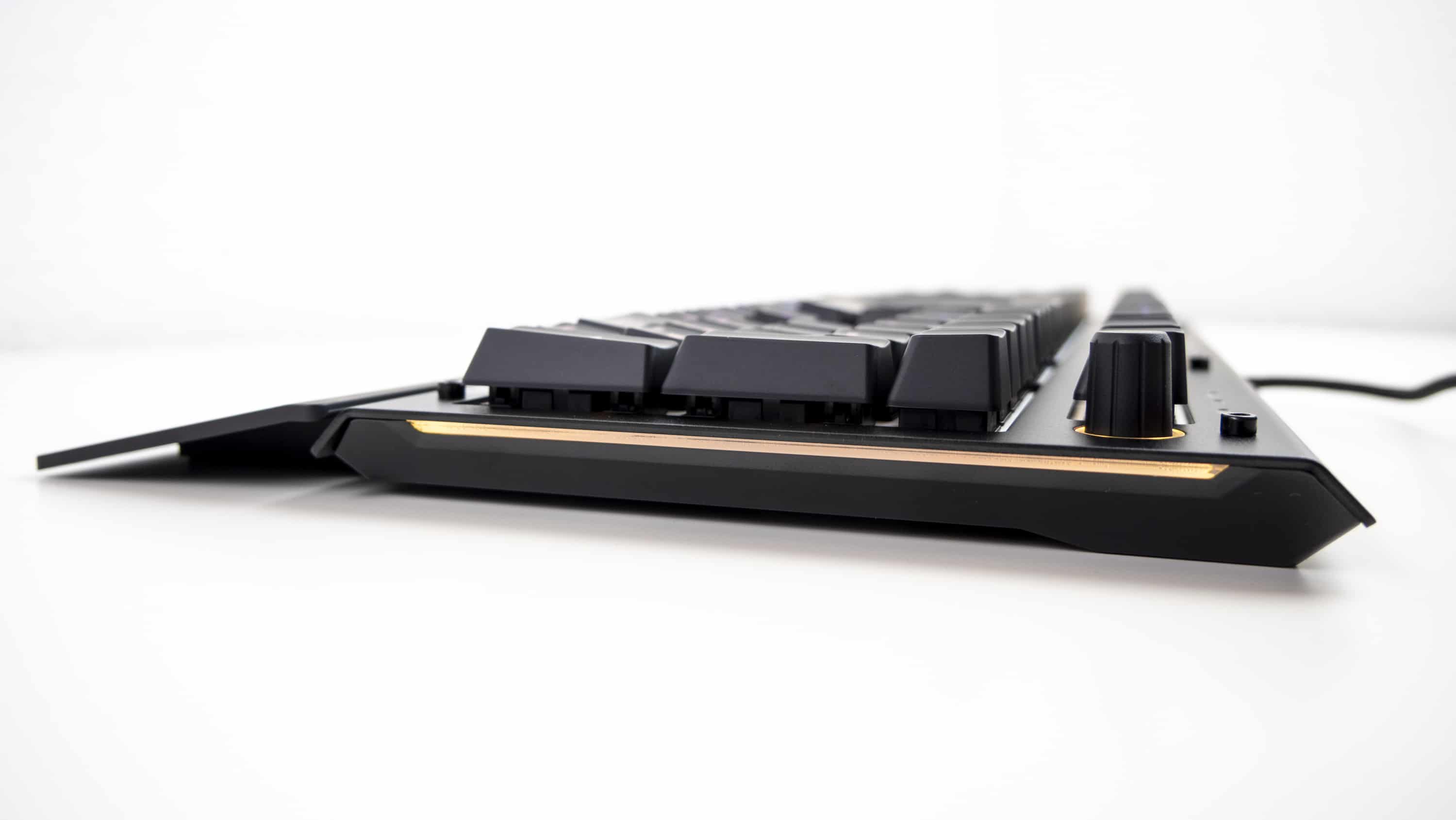 Mit 320 Millimetern ist Das Keyboard X50Q besonders flach gehalten, was durchaus eine Seltenheit unter Gaming-Tastaturen ist. Von der Seite betrachtet ergibt das Gehäuse die Form zweier gespiegelter Trapeze, wodurch die Kanten links und rechts spitz zueinander führen. Garniert werden die Seiten mit zwei Lichtleisten, die durch die RGB-Beleuchtung bestrahlt werden und somit später über die Software individualisierbar sind. Auch aus dieser Ansicht in unseren Augen ein gelungenes Design.
