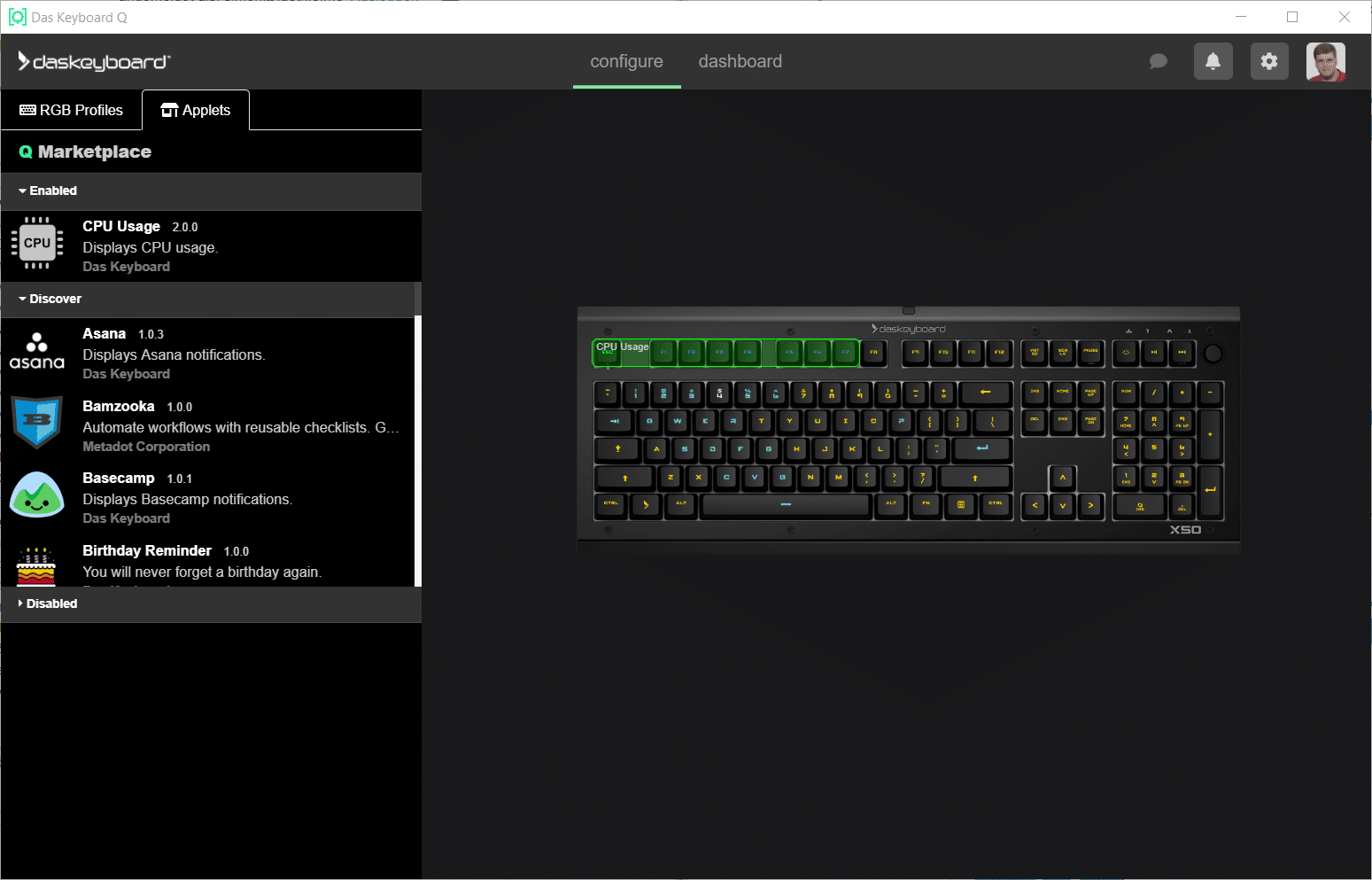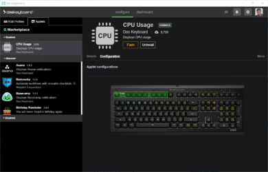 Die Software, welche sich Das Keyboard Q nennt, zeigt dabei grafisch die Tastatur an. Geht man mit dem Mauszeiger über die bereits belegten Tasten, erscheinen kleine Infofenster, die über das jeweilige Applet informieren. Diese können aus der Software-Bibliothek heraus installiert werden. Wir haben nicht gezählt, aber wir konnten eine Weile scrollen, was heißt: es stehen sehr viele Applets zur Auswahl, auch populäre wie GitHub, Twitch oder Trello.