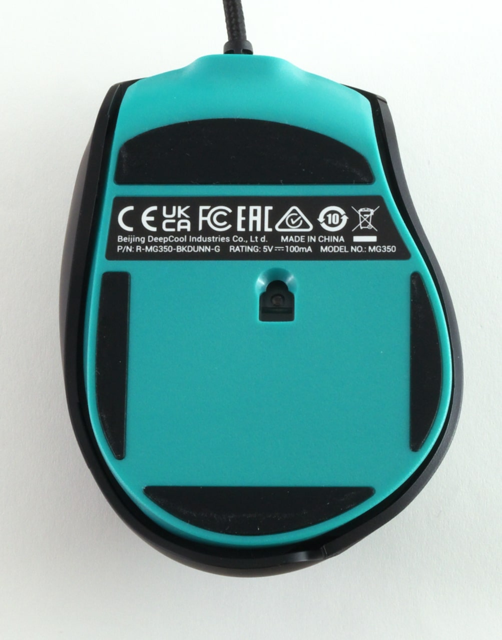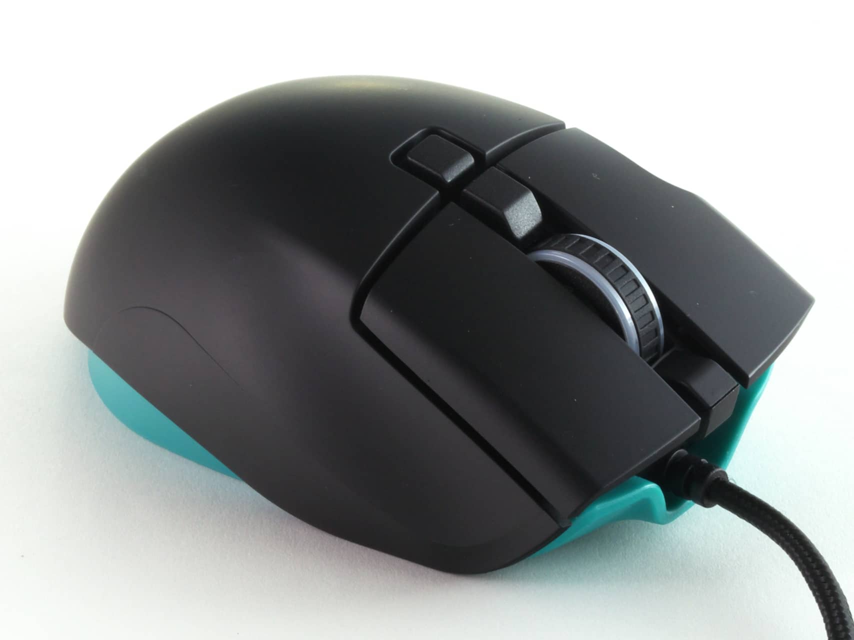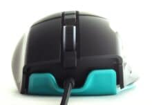 Ungewöhnlich ist an der Maus, neben der grundlegenden Form, auch der Einsatz von zwei unterschiedlichen Materialien für das Gehäuse. Die gesamte Unterseite der MG350 ist Cyan eingefärbt, wohingegen die Oberfläche auf mattschwarzen Kunststoff setzt. Dieser ist fast überall gummiert, lediglich am Bereich des Daumens ist sie stattdessen aufgeraut.