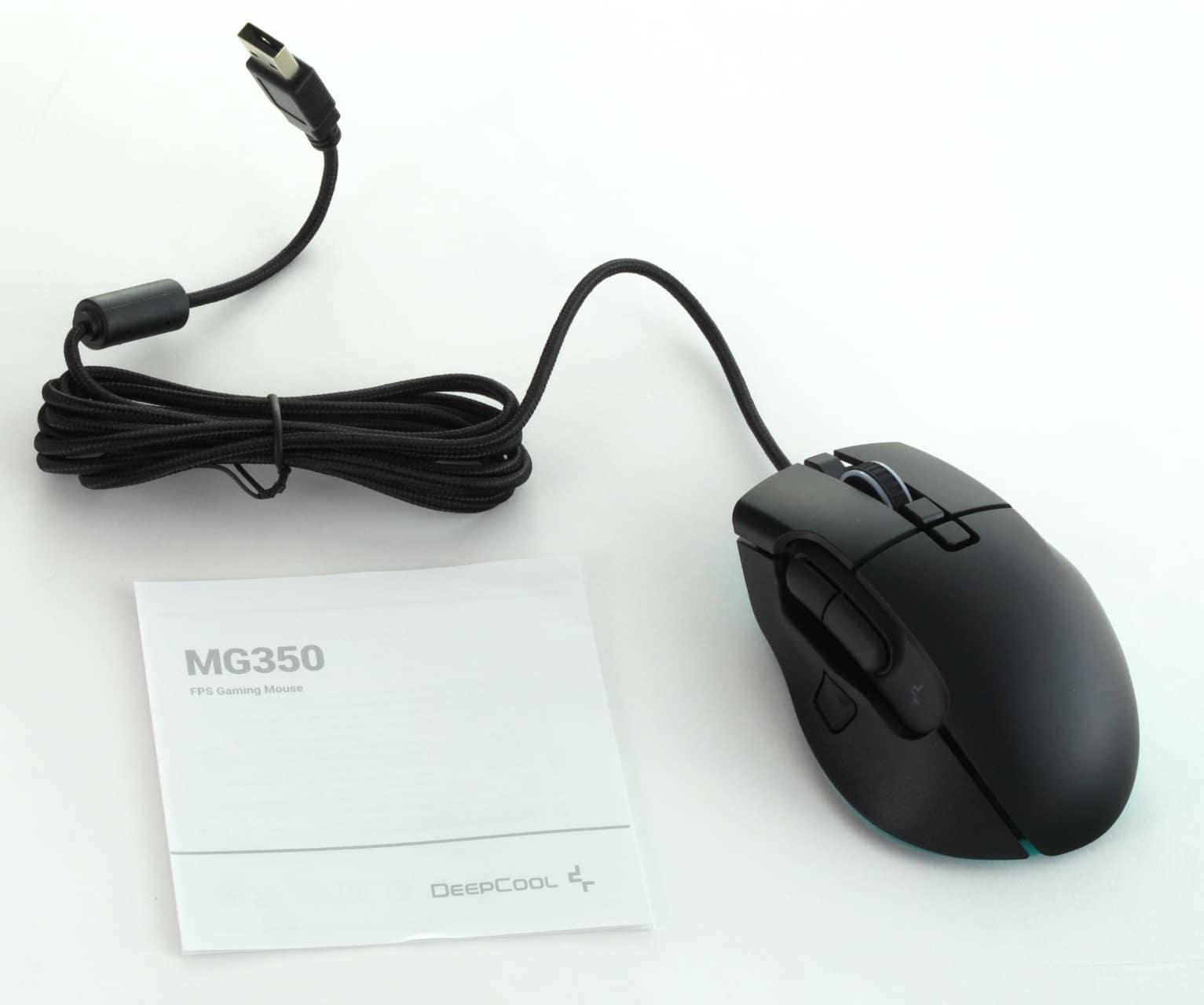 Die DeepCool MG350 wird in einem weißen, farbig bedruckten Karton geliefert. Darin befindet sich, neben der Maus selbst, lediglich noch eine kurze Produktübersicht. In dieser wird das Layout der Maus erklärt. Weiteres Zubehör gibt es nicht: Das zwei Meter lange und gesleevte Kabel ist fest an der Maus angelötet.