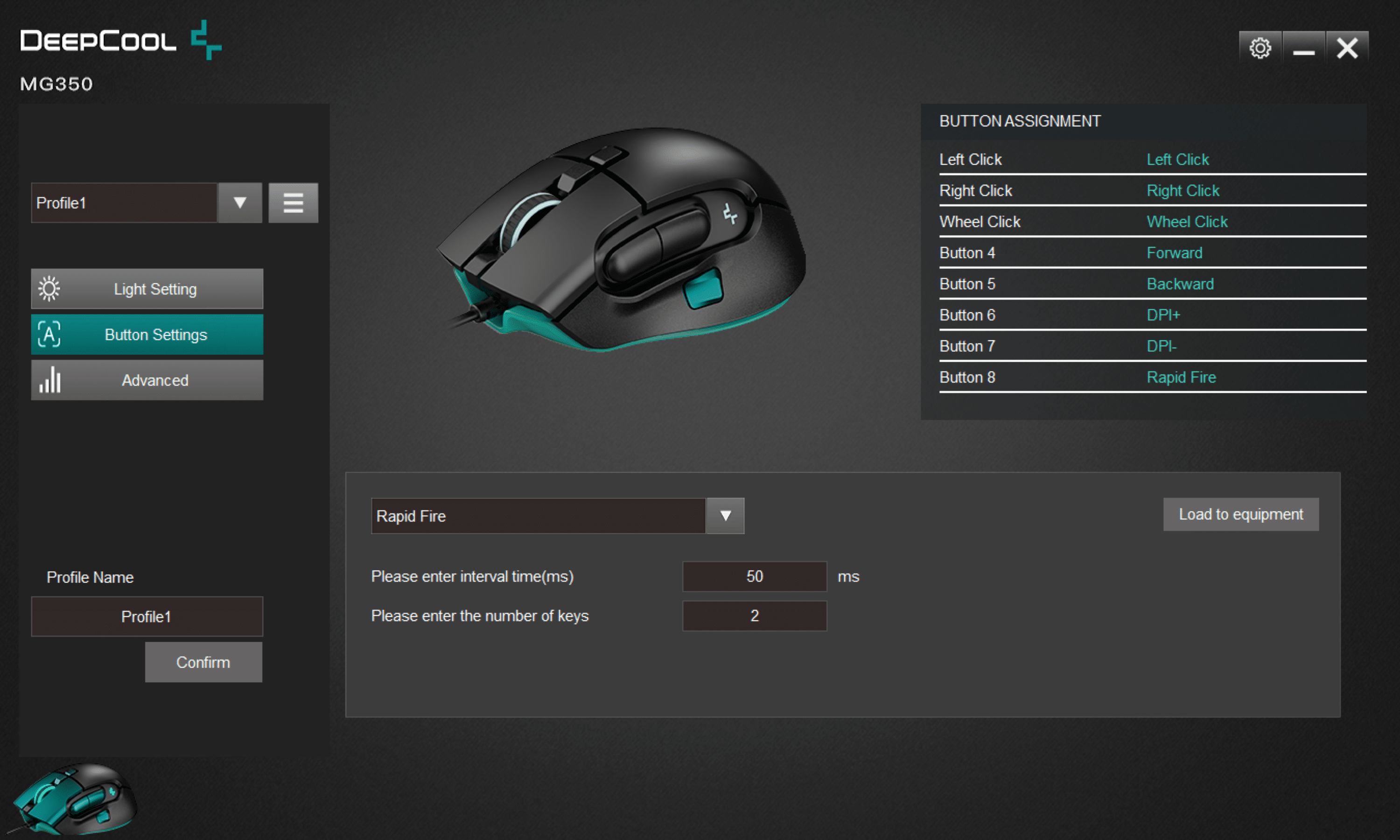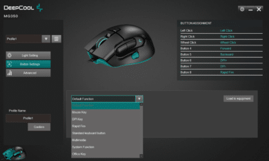 Alle acht Tasten der MG350 können in der Software frei mit einer anderen Funktion belegt werden. Dabei stehen unter anderem Tastatur- und Multimedia-Hotkeys sowie eine Schnellfeuer-Funktion zur Verfügung. Letztere ist dabei die Standardbelegung der Daumen-Zusatztaste. Auch hier werden durch die Software somit die meisten Wünsche abgedeckt – denn die fehlende Makro-Funktion ist bei Mäusen nur bedingt nützlich. Manche Nutzer könnten sich womöglich aber auch noch eine Aim-Funktion wünschen, die sich für Daumentaste angeboten hätte.