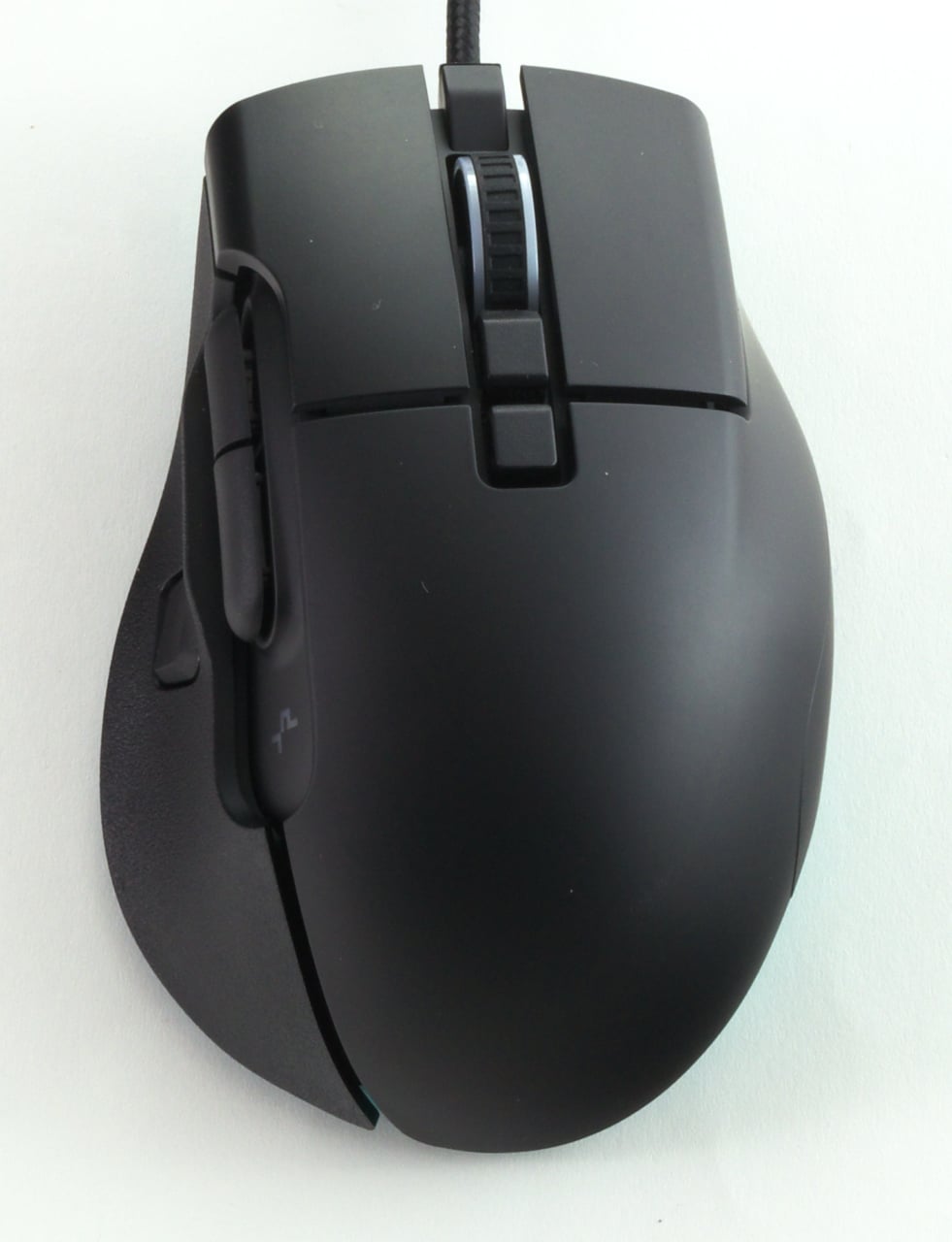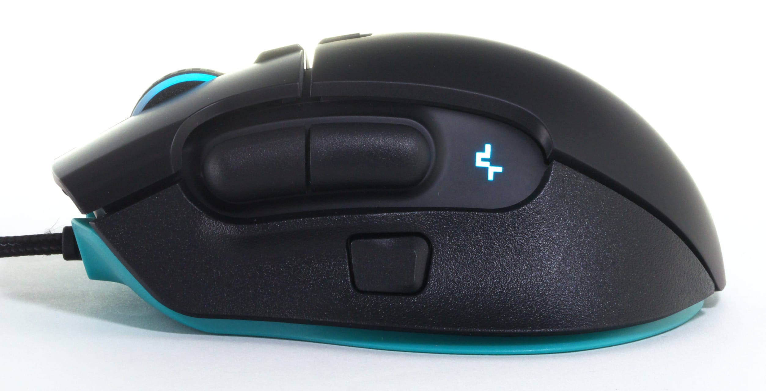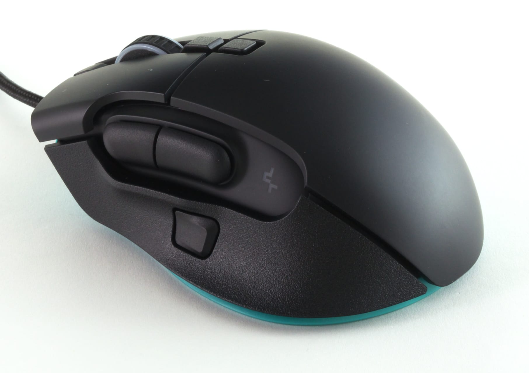 Auch bei der grundlegenden Konstruktion kann DeepCools Neuling überzeugen: Die an der Maus verbauten Oberflächen sind haptisch sehr angenehm, und zudem ist das Gehäuse verwindungssteif und optisch einwandfrei verarbeitet. Lediglich an einer Stelle fanden wir eine kleine Auffälligkeit: Die an der linken Seite verbaute Daumenauflage lässt sich an den mittleren Spitze, direkt hinter dem DeepCool-Logo, ein Stück weit eindrücken. Außerdem steht sie minimal weiter ab als der angrenzende Mausrückens. Sichtbar ist das nicht, wenn man diese Stelle mit dem Finger abfährt, dann lässt sich aber der leicht hervorragende Kunststoff spüren. Da dieser Bereich der Maus im normalen Betrieb nie berührt wird, sollte das in der Praxis zwar kein Problem sein. Es hätte aber natürlich trotzdem vermieden werden können
