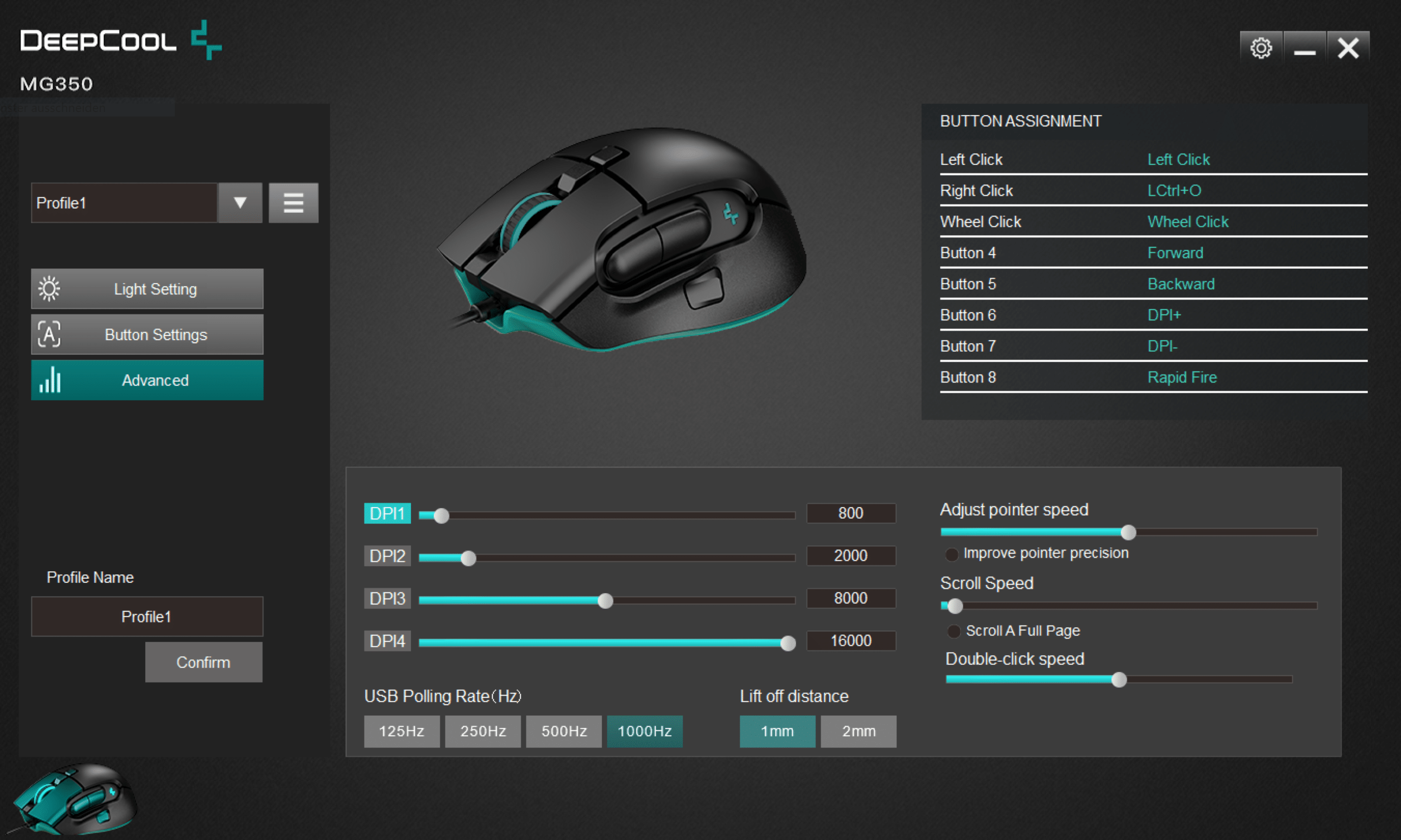 Beim Sensor bietet die MG350 vier DPI-Stufen, die in Hunderterschritten im Bereich zwischen 100 und 16.000 DPI verstellt werden können. Außerdem lässt sich die Lift-Off-Distanz (1mm, 2mm) sowie die Polling-Rate (125-1.000 Hz) einstellen.