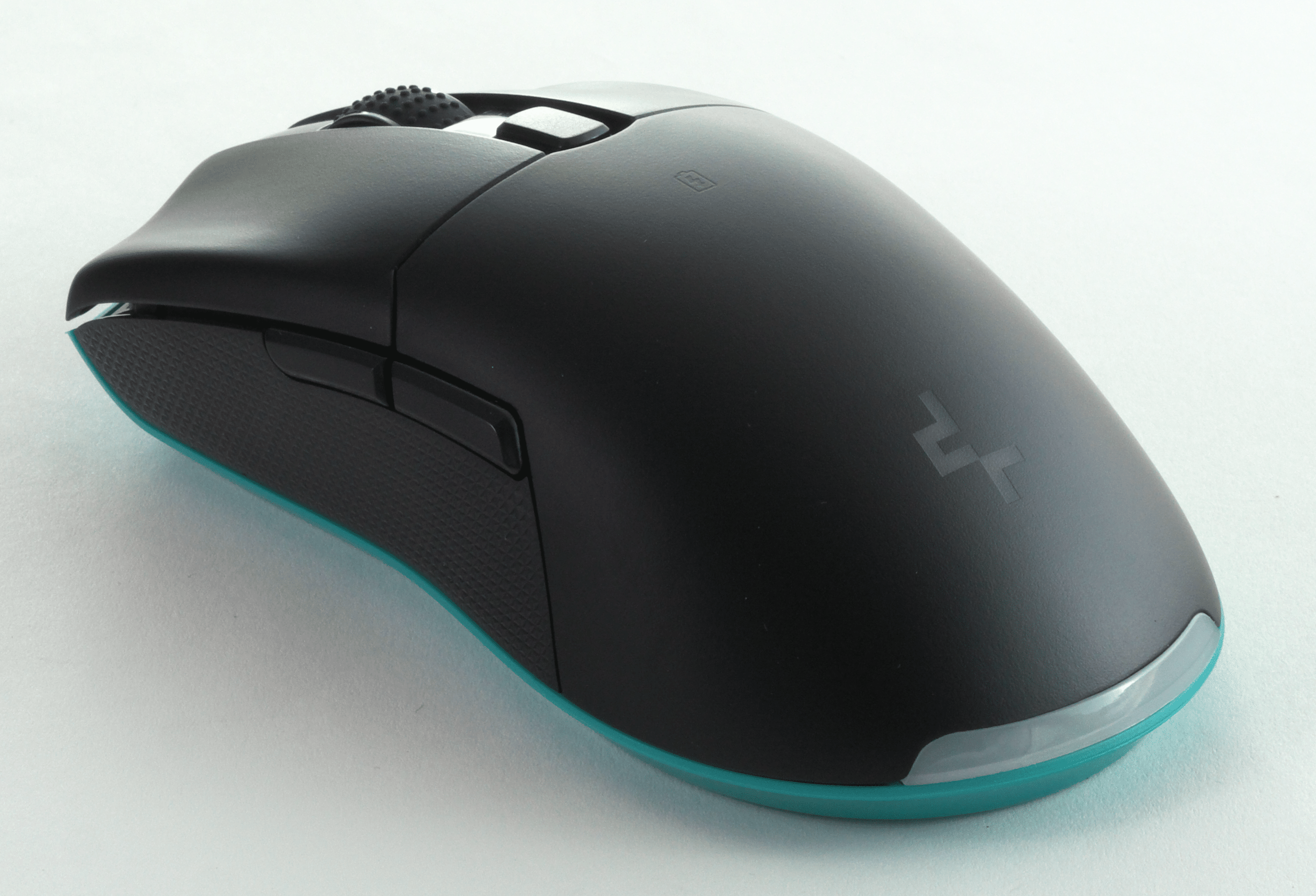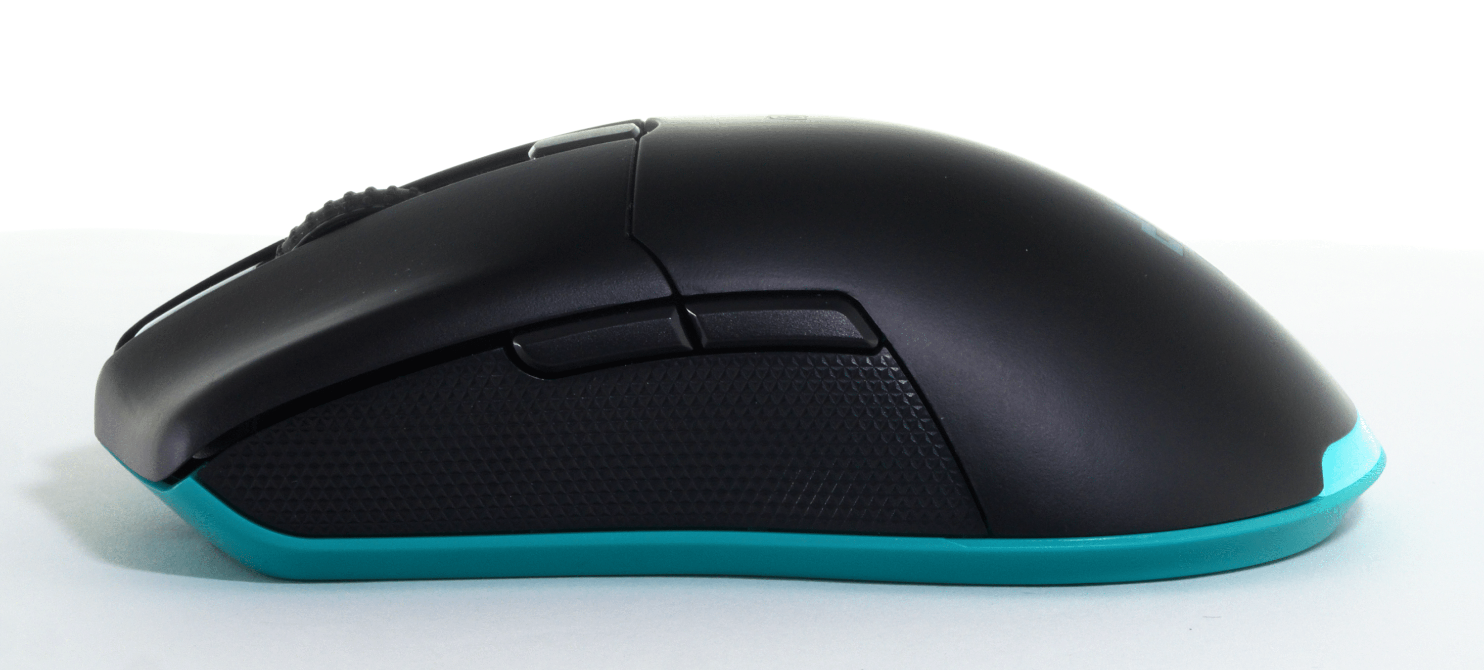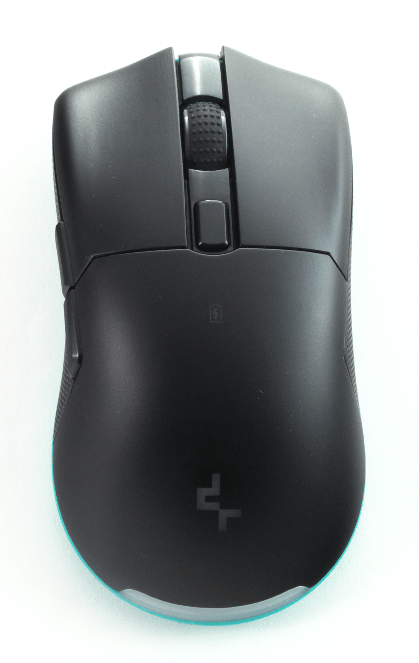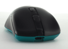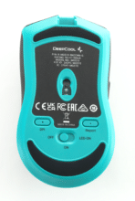 An Materialien setzt DeepCools neue Maus auf mattschwarzen Kunststoff an der Oberfläche sowie auf Hochglanz-Kunststoff im Bereich des Mausrads. Außerdem gibt es am Mausrücken transparente Elemente für die Beleuchtung, an den Seitenteilen eine strukturiert-schwarze Oberfläche, und unten gar eine komplett andere Farbe. Die gesamte Unterseite, und auch der untere Seitenstreifen der MG510, ist Türkis. Dadurch ist bei der Maus immer ein dünner Farbstreifen zu sehen. Auffällig ist an der Maus außerdem noch die Beschichtung des Mausrads, denn dieses verfügt über eine Vielzahl kleiner Gumminoppen.