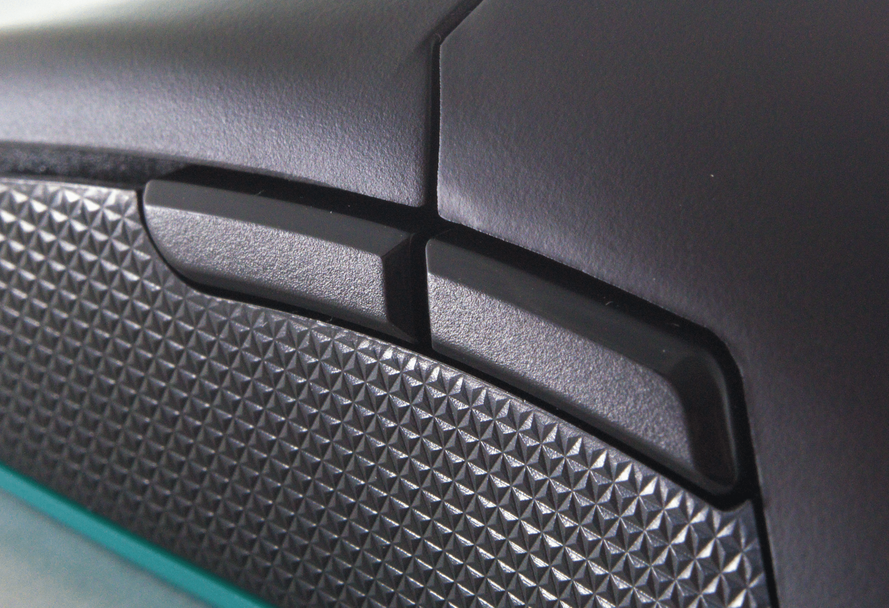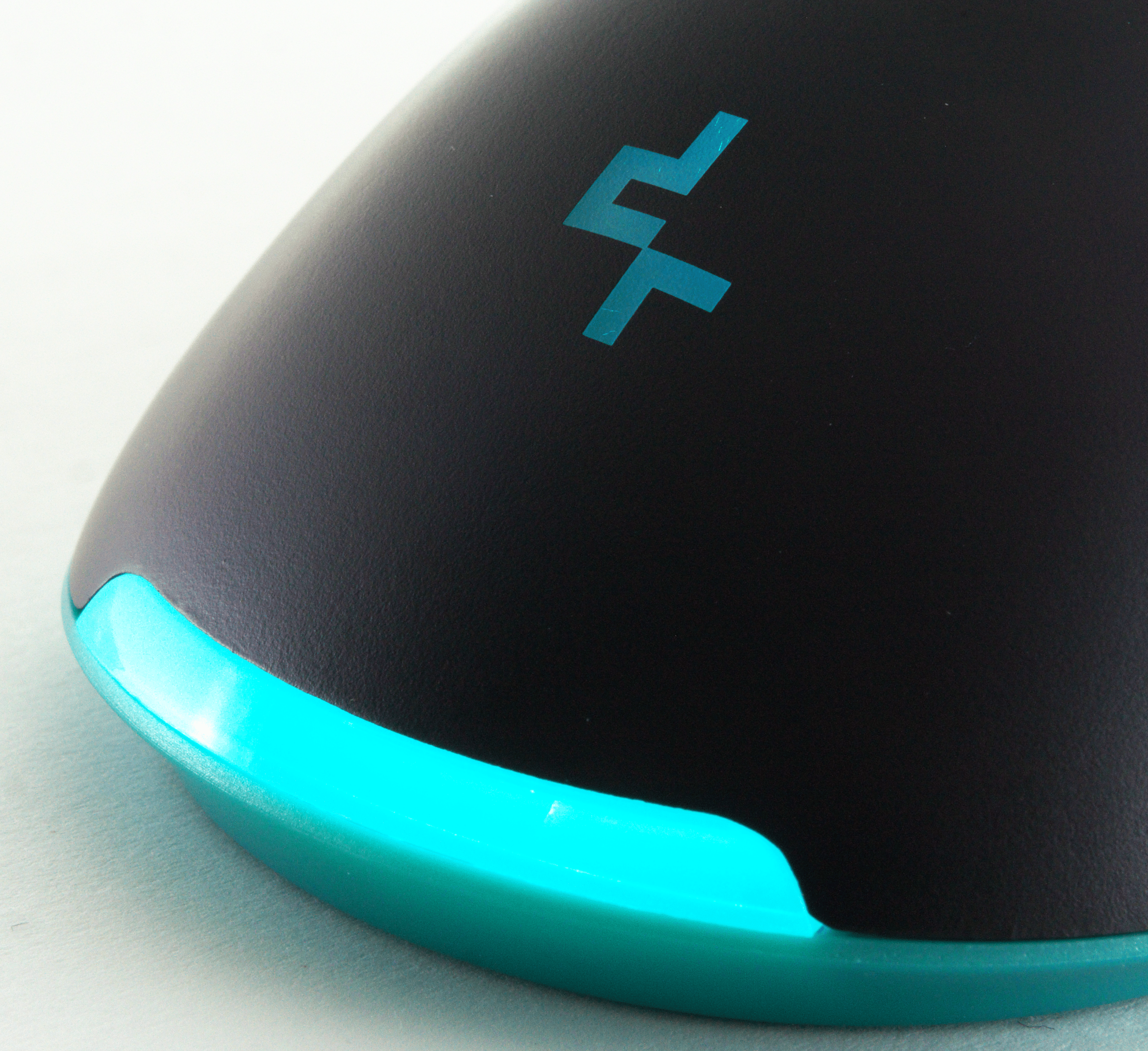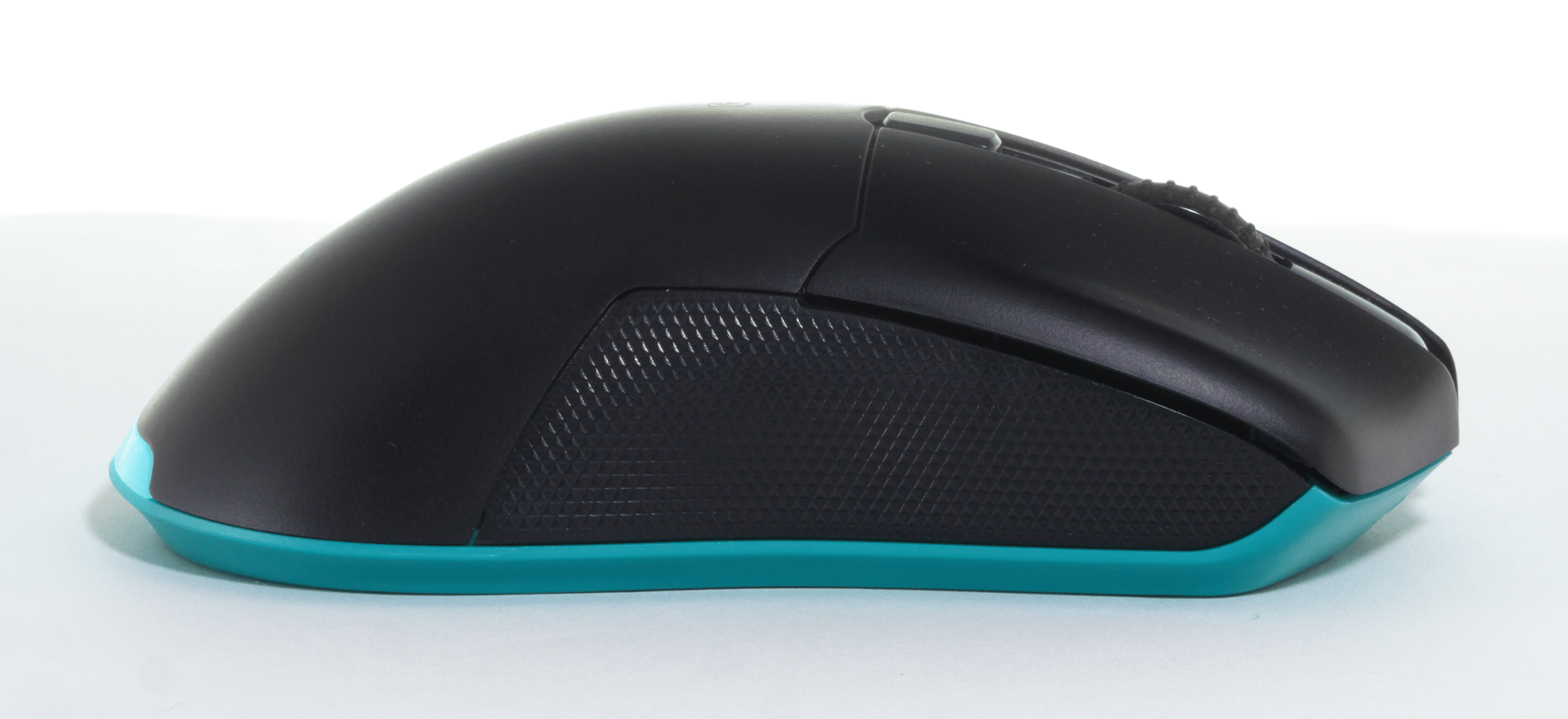 An Materialien setzt DeepCools neue Maus auf mattschwarzen Kunststoff an der Oberfläche sowie auf Hochglanz-Kunststoff im Bereich des Mausrads. Außerdem gibt es am Mausrücken transparente Elemente für die Beleuchtung, an den Seitenteilen eine strukturiert-schwarze Oberfläche, und unten gar eine komplett andere Farbe. Die gesamte Unterseite, und auch der untere Seitenstreifen der MG510, ist Türkis. Dadurch ist bei der Maus immer ein dünner Farbstreifen zu sehen. Auffällig ist an der Maus außerdem noch die Beschichtung des Mausrads, denn dieses verfügt über eine Vielzahl kleiner Gumminoppen.