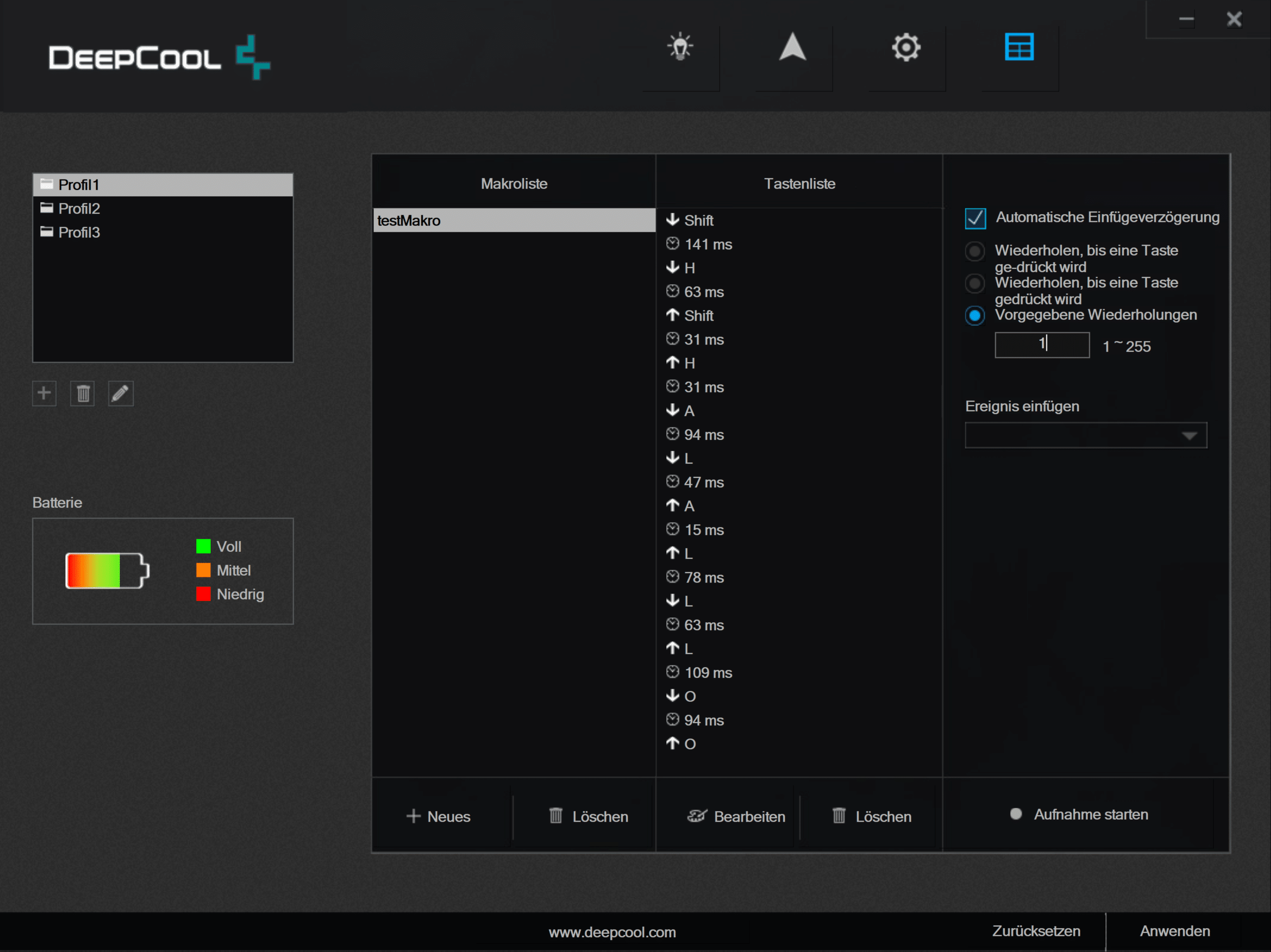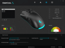 Zuletzt bietet DeepCools Konfigurationssoftware noch die üblichen Windows-Einstellungsmöglichkeiten, eine konfigurierbare Polling-Rate und eine Tasten-Konfiguration. Mit dieser können alle Tasten auf der Oberseite mit anderen Funktionen belegt werden, wobei Maus-, Tastatur-, Multimedia- und Makro-Funktionen mit einer Länge von maximal 84 Zeichen zur Verfügung stehen. Alle diese Einstellungen landen dabei im Speicher der Maus und sind somit auch ohne die Software funktional. Wirklich vermisst haben wir am Ende lediglich eine Option, um die Standby-Zeiten im kabellosen Modus einzustellen. So muss man damit leben, dass die Maus ohne Stromversorgung immer nach 60 Sekunden die Beleuchtung deaktiviert. Abseits davon dürfte die MG510 in puncto Software aber kaum Wünsche offen lassen.