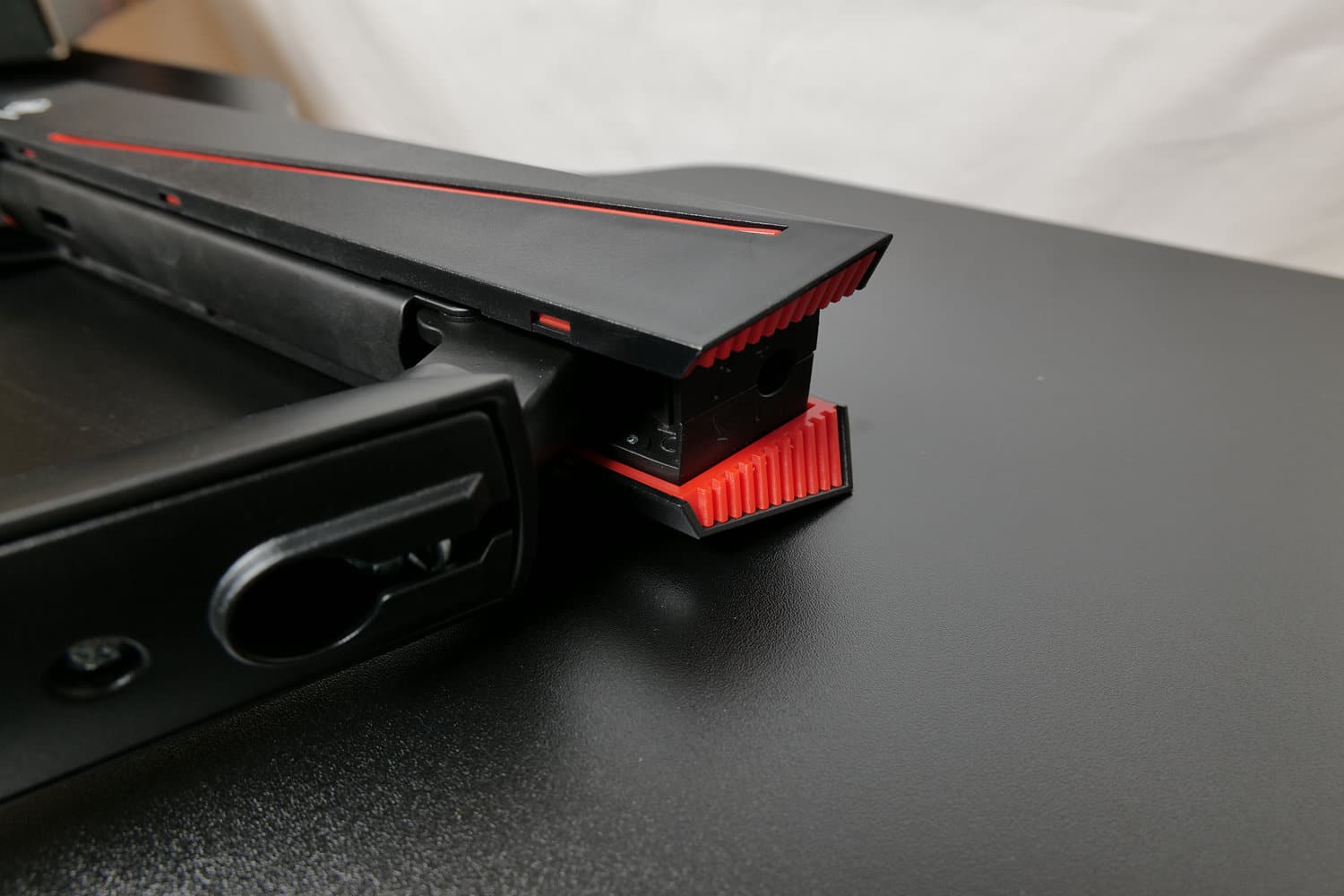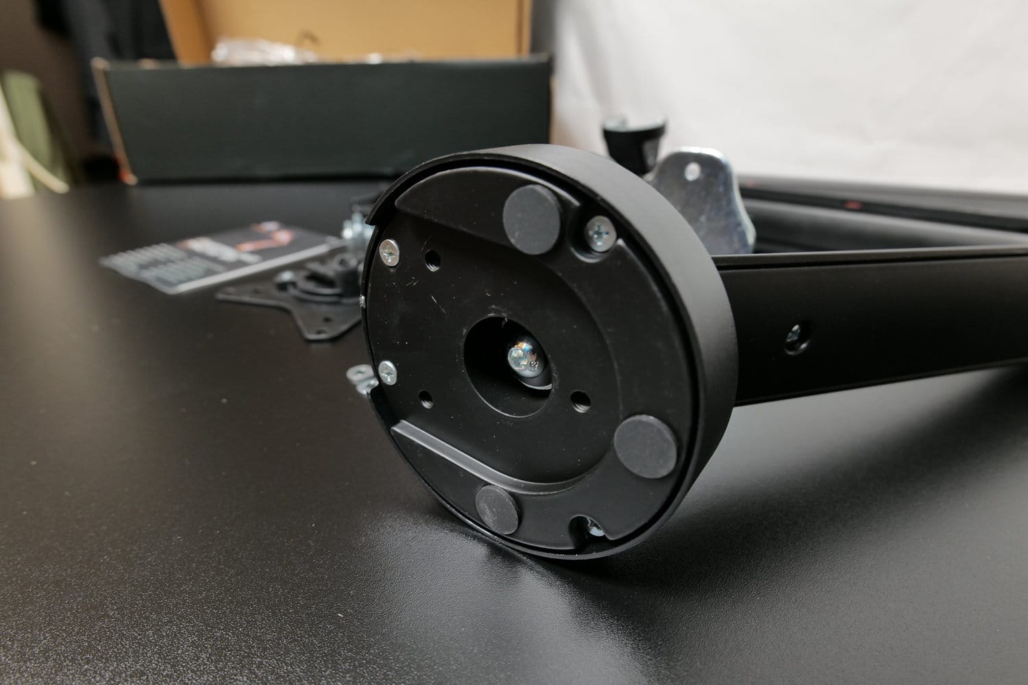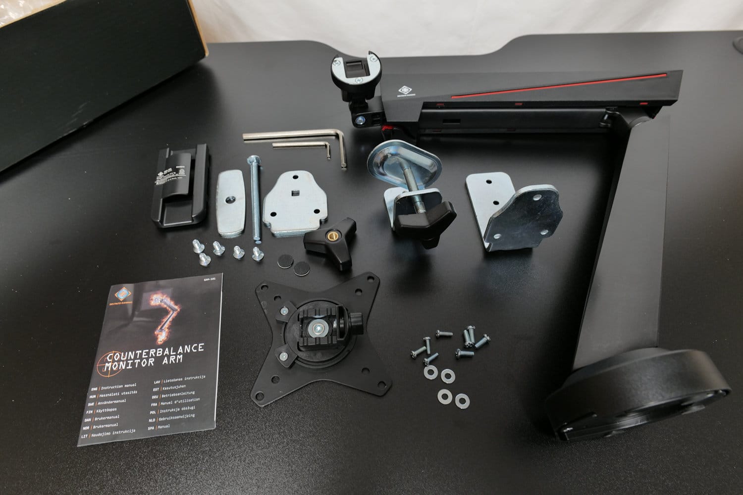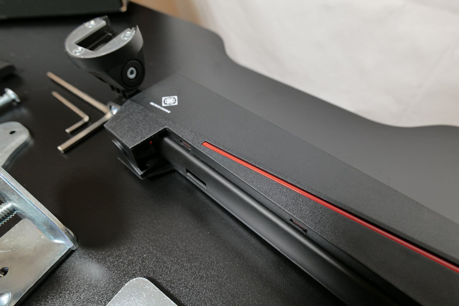 Die GAM-101 ist laut Montageanleitung mit Tischplatten aus Holz, Holzfaserplatten und Spanplatten kompatibel. Billige Tischplatten aus Papier in Wabenstruktur und ähnliche Hohlkammer-Bauweisen bieten dagegen nicht die nötige Stabilität. Für unseren Test montieren wir die Halterung am DT410, einem elektrisch höhenverstellbaren Schreibtisch von Deltaco Gaming mit 1,8 cm dicker Spanplatte, welchen wir ebenfalls ausführlich getestet haben.