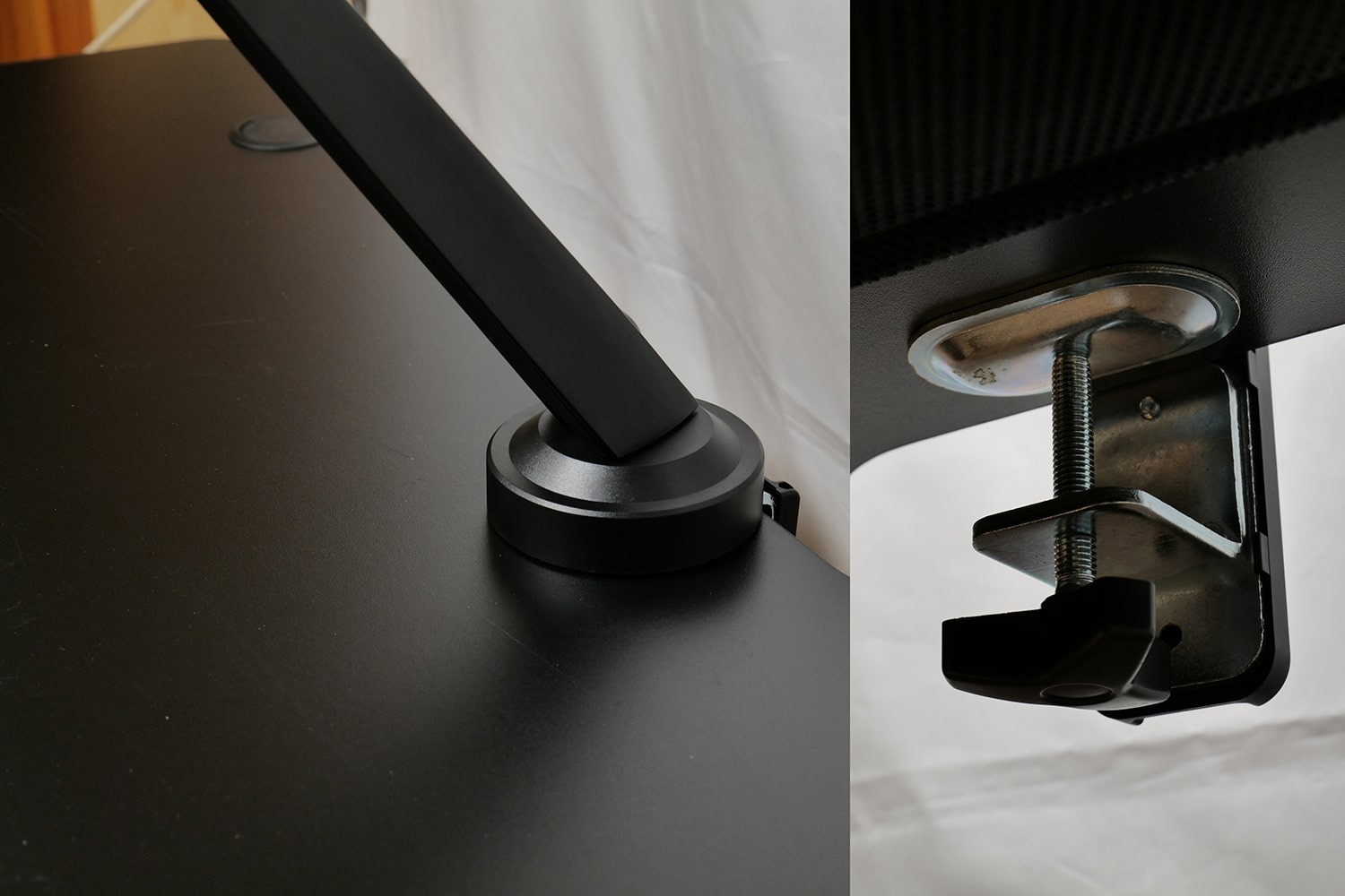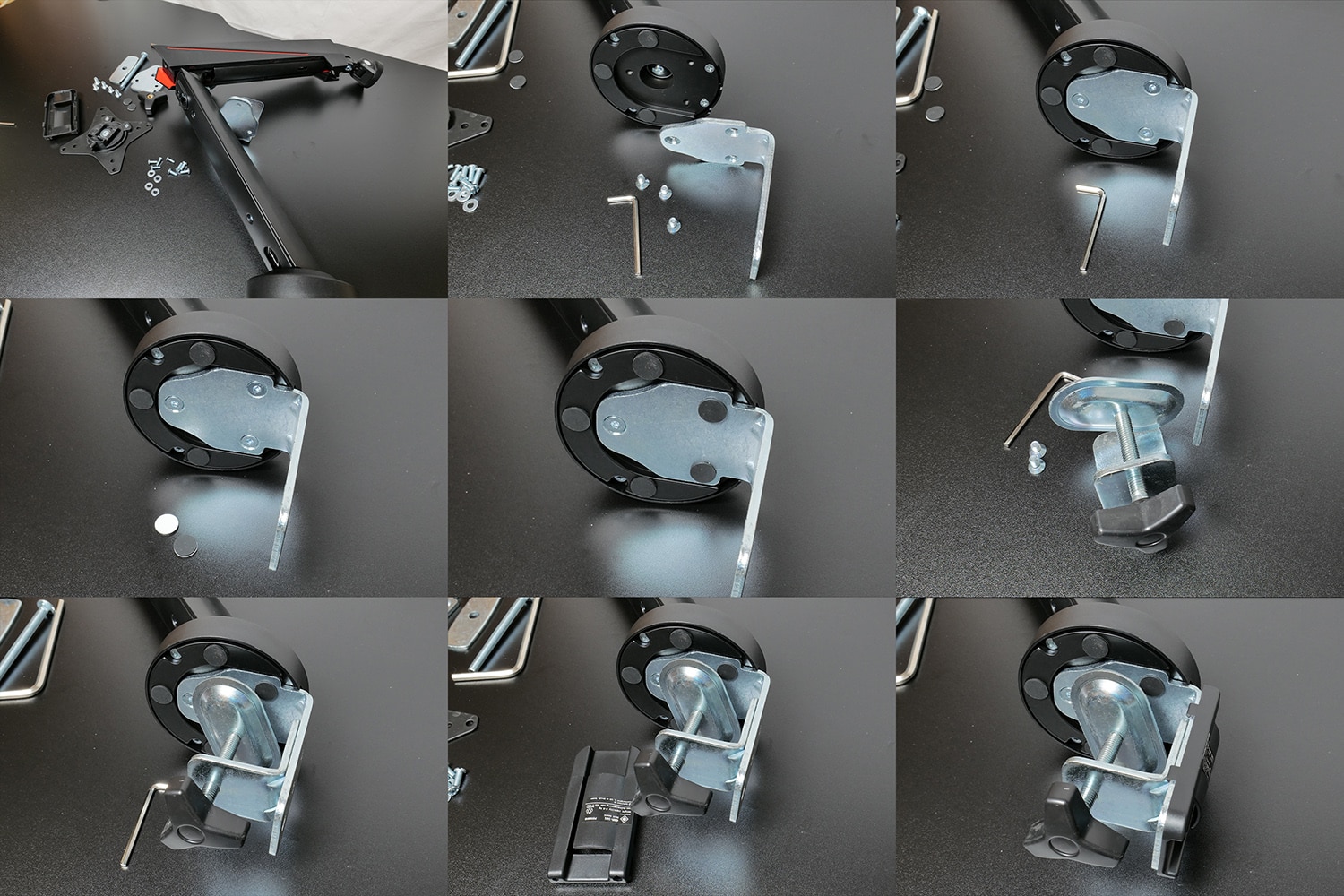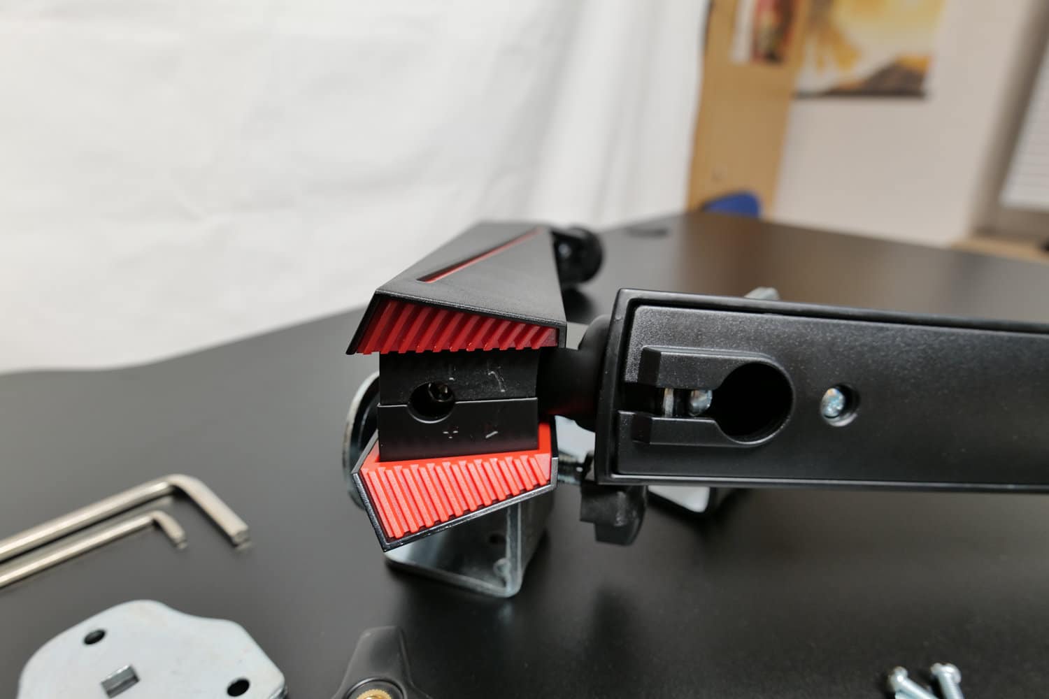 Die Montage der GAM-101 gestaltete sich überwiegend unproblematisch. Die meisten Schritte konnten wir mit den beiliegenden Sechskantschlüsseln durchführen. Wie unter dem Punkt Verpackung bereits beschrieben, lässt sich die Monitorhalterung sowohl an der Tischkante, als auch durch eine 10mm Bohrung in der Tischplatte am Tisch befestigen. Wir nutzten für unseren Test die nicht-invasive Befestigungsmethode per Schraubzwinge an der Tischkante. In welchem Abstand zum Sockel die Schraubzwinge am Sockel montiert wird, richtet sich nach der Dicke der Tischplatte.
