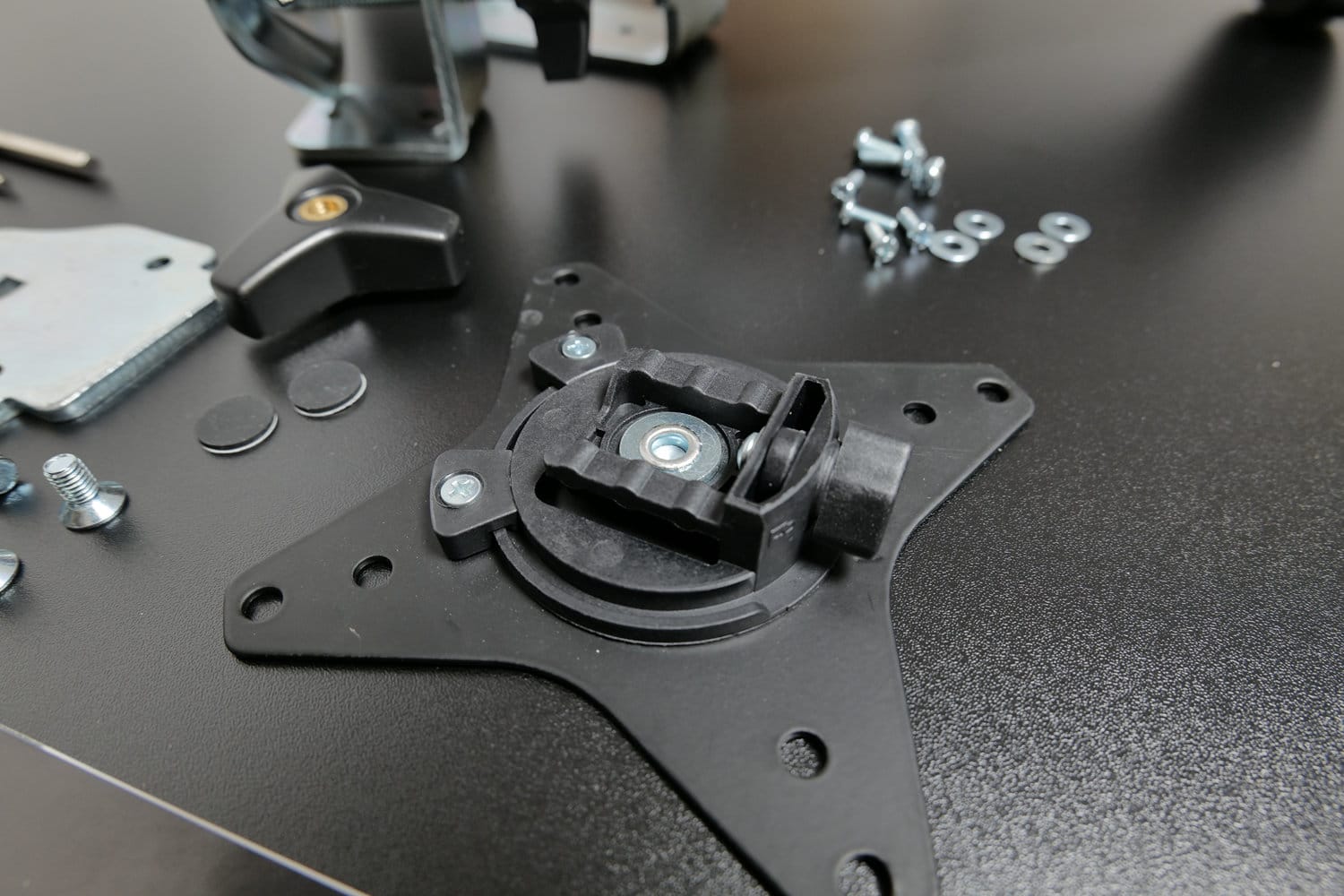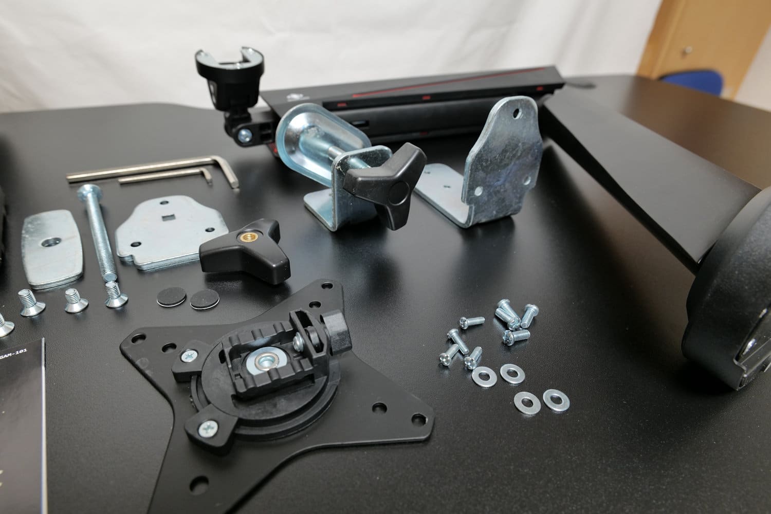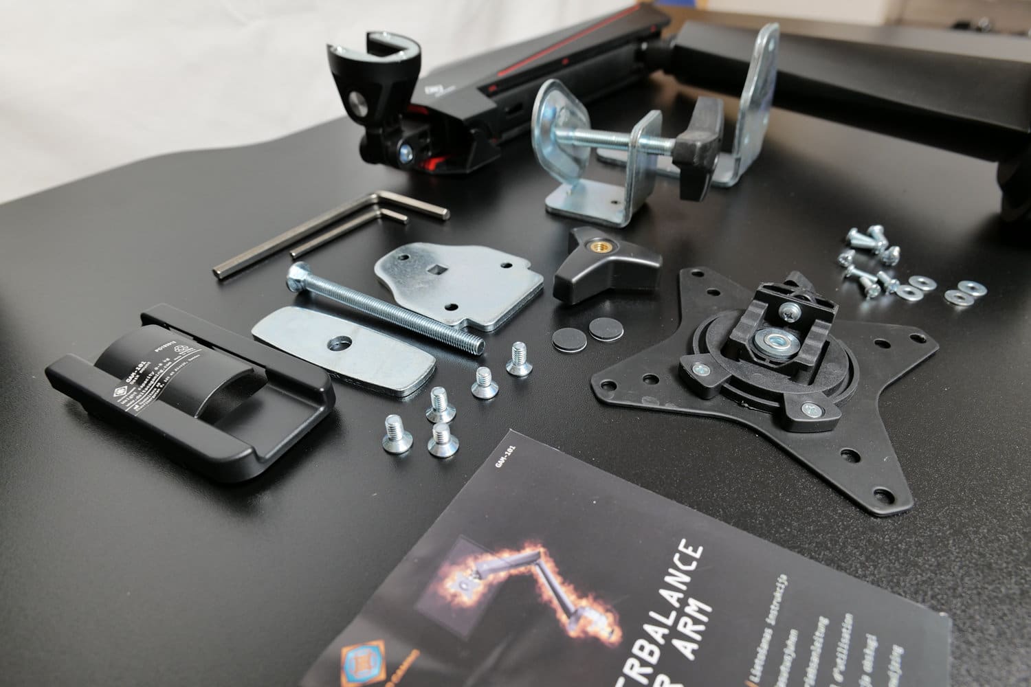 Da sich die GAM-101 auf zwei verschiedene Methoden an einer Tischplatte befestigen lässt, einmal an der Tischkante und einmal durch eine Bohrung in der Platte, sind im Lieferumfang Teile für beide Methoden enthalten. Wir haben für diesen Test die Befestigung an der Tischkante genutzt.